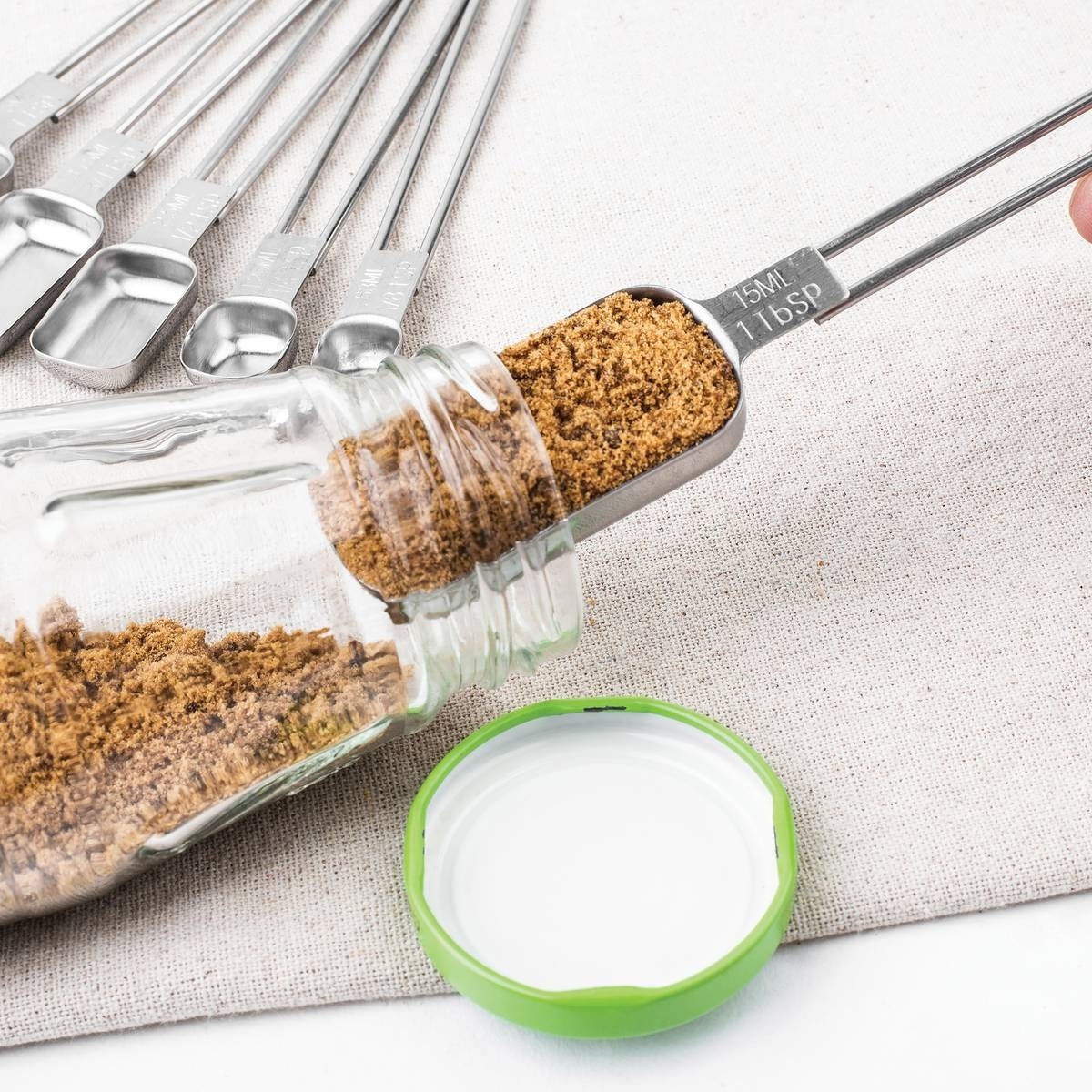 This stainless steel Measuring Spoon Set is an essential part of the prep process and features a unique scoop design. The narrow shape makes it easy to reach into small spice jars, bottles, or tubes!
