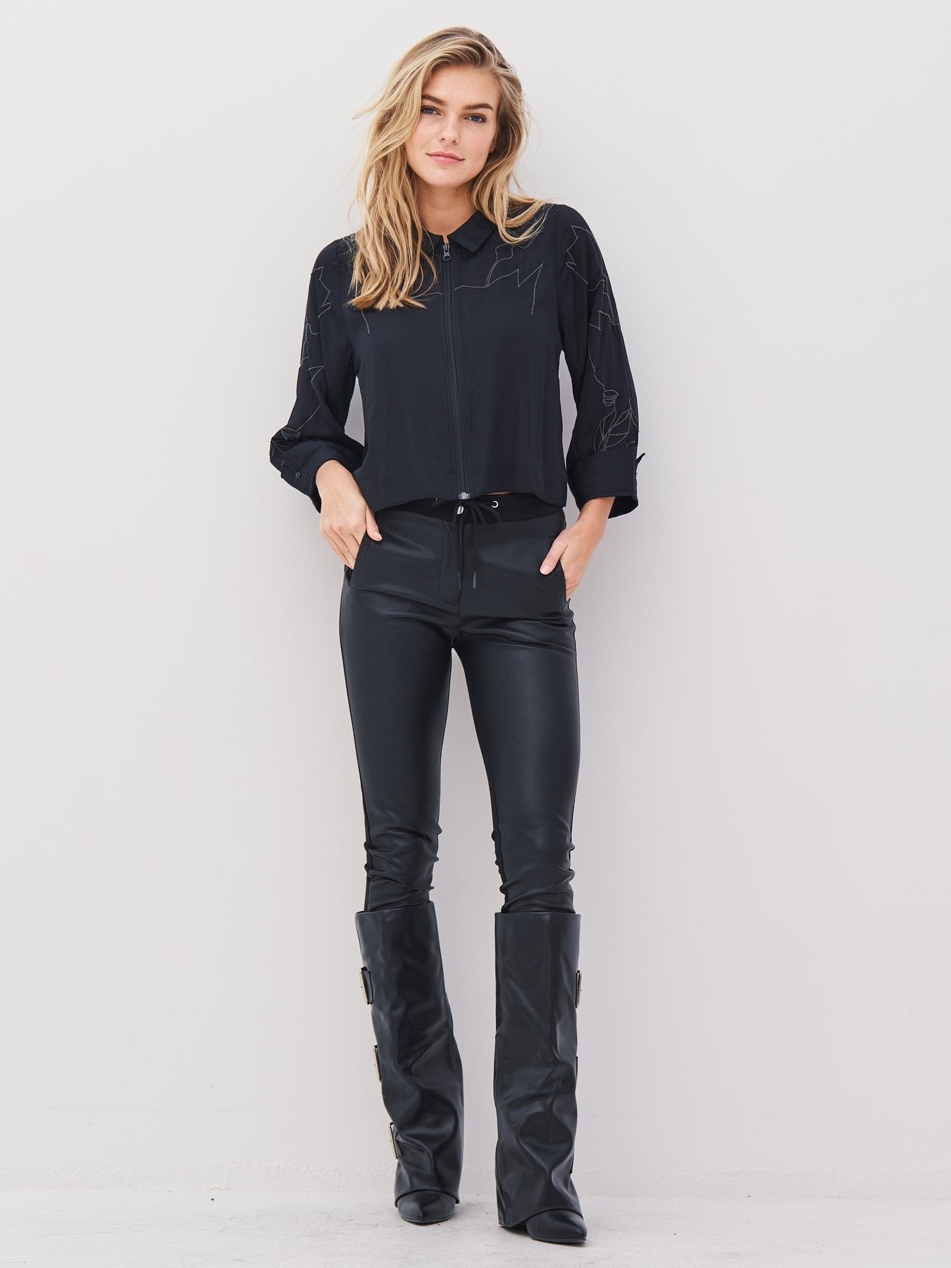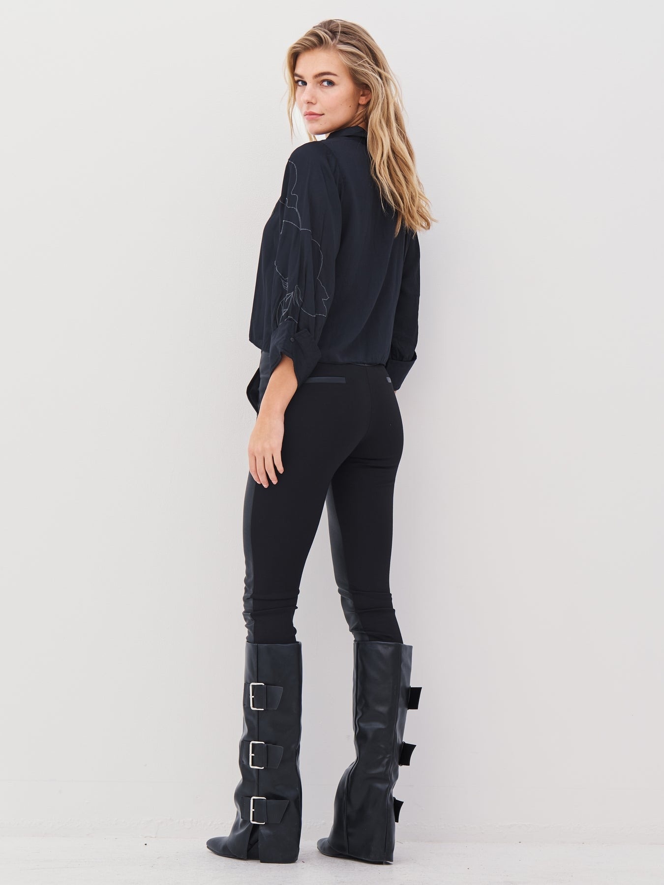 These leggings combine comfort and style with a design that features faux leather in the front and soft, elastic material at the back. Style the leggings with a light blouse and boots for a stylish everyday look with an edge.