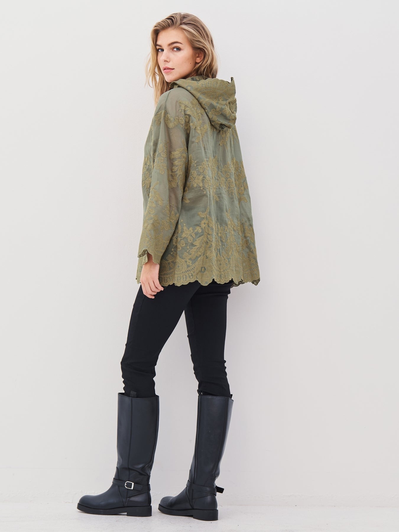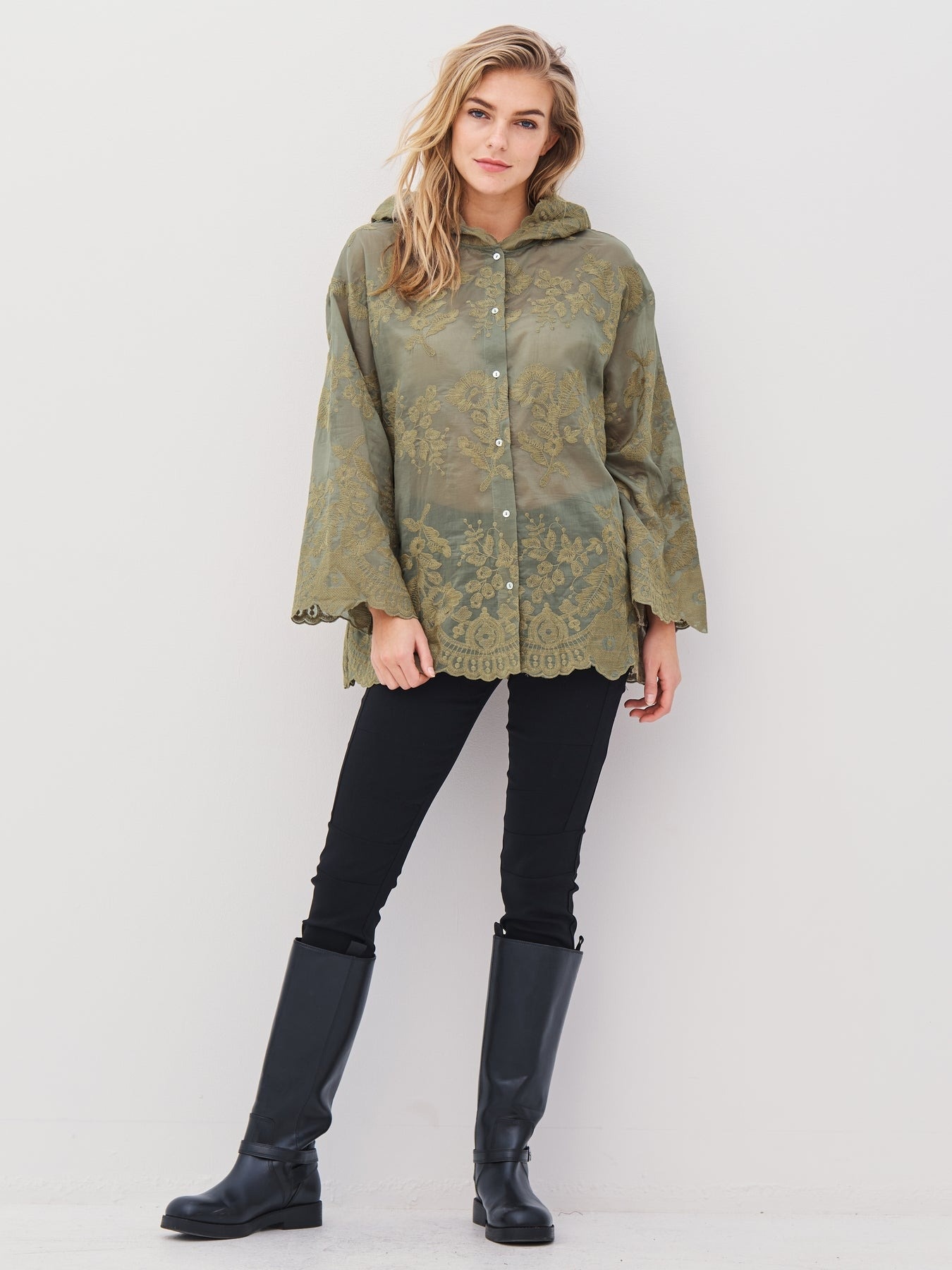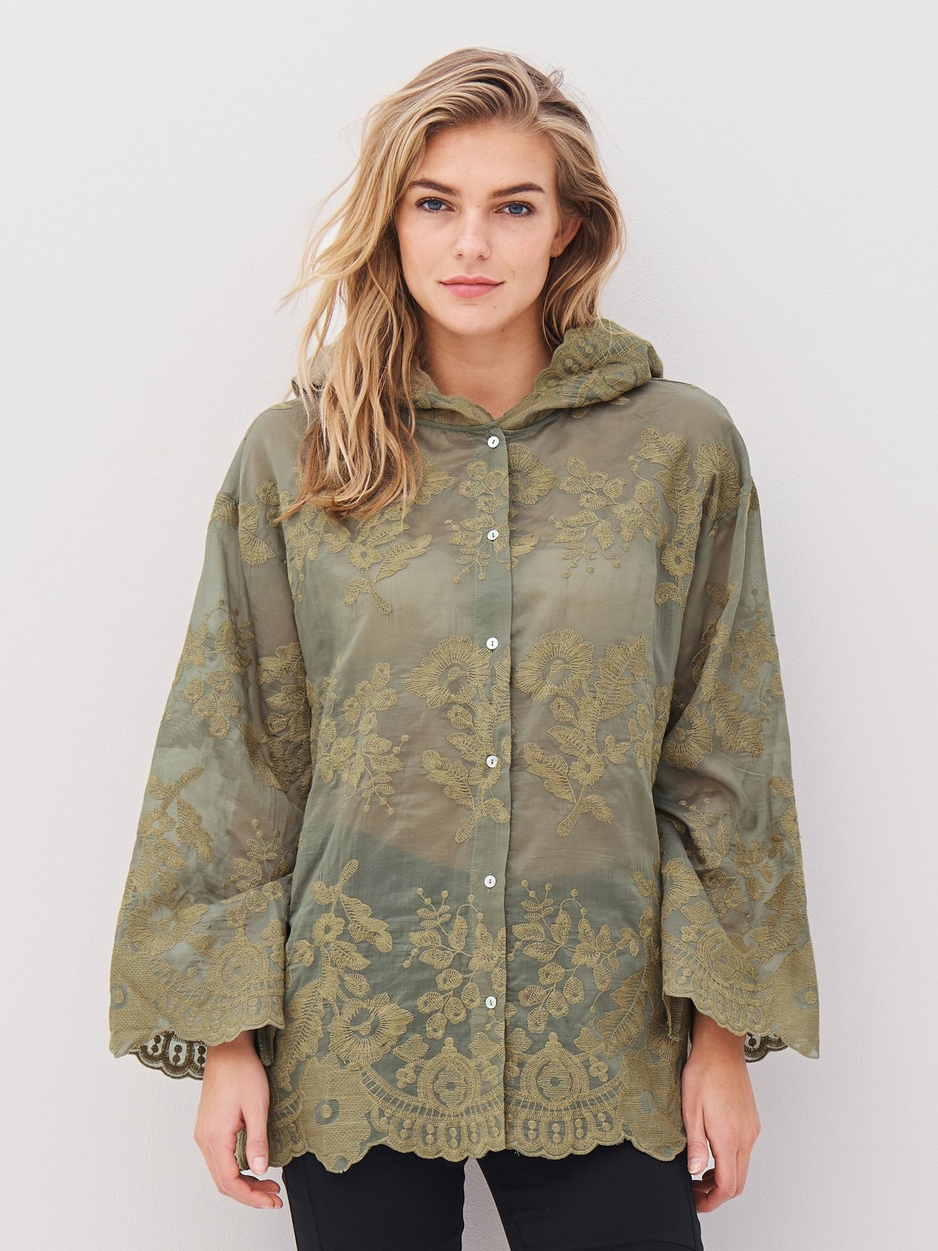 The shirt has a feminine and airy expression with embroidered flowers and lightweight translucent material. It is designed with a hood, mother-of-pearl buttons, and wide sleeves, which provide a relaxed and elegant silhouette.