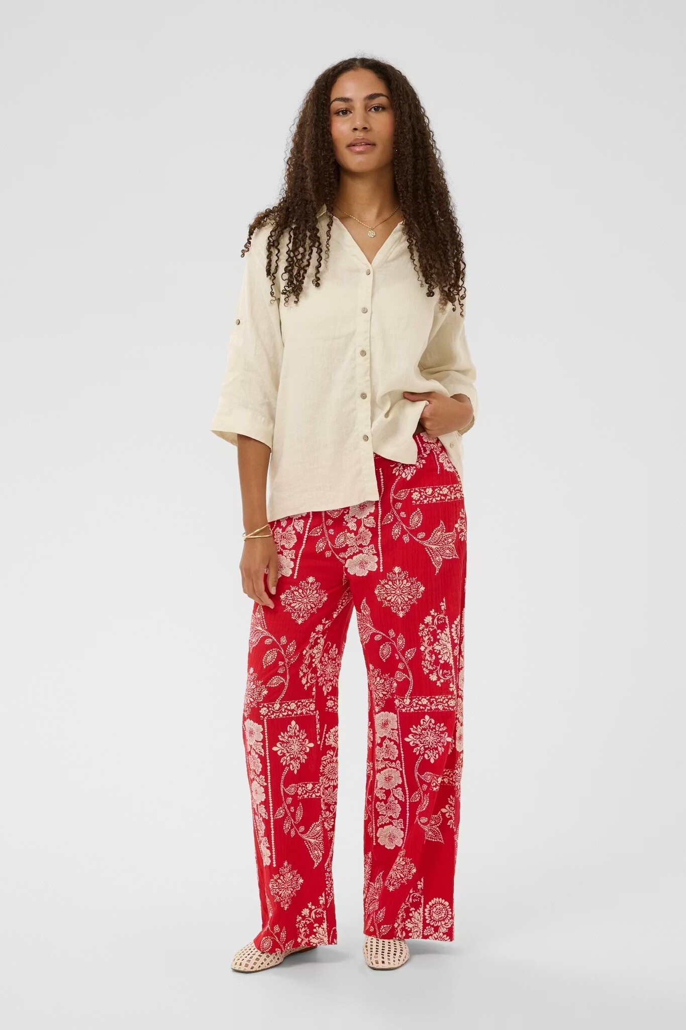 Experience casual elegance with this linen long-sleeved shirt. Boasting an oversize fit, mid-thigh length, and chic 3/4 sleeves, it is the perfect addition to your wardrobe. Pairs well with fitted jeans.
