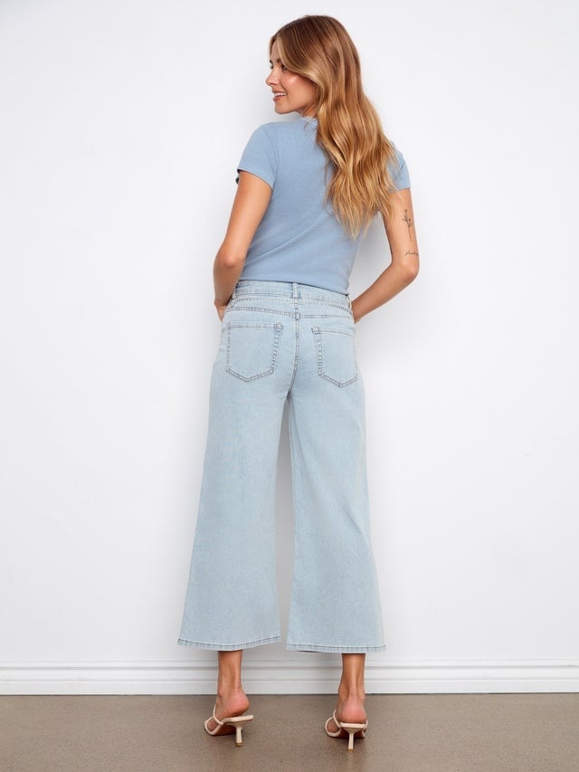 Discover the perfect warm-weather staple with these belted cropped wide-leg jean in a bleach blue shade. Made from soft denim fabric, they offer a comfortable fit with an easy, flattering shape.