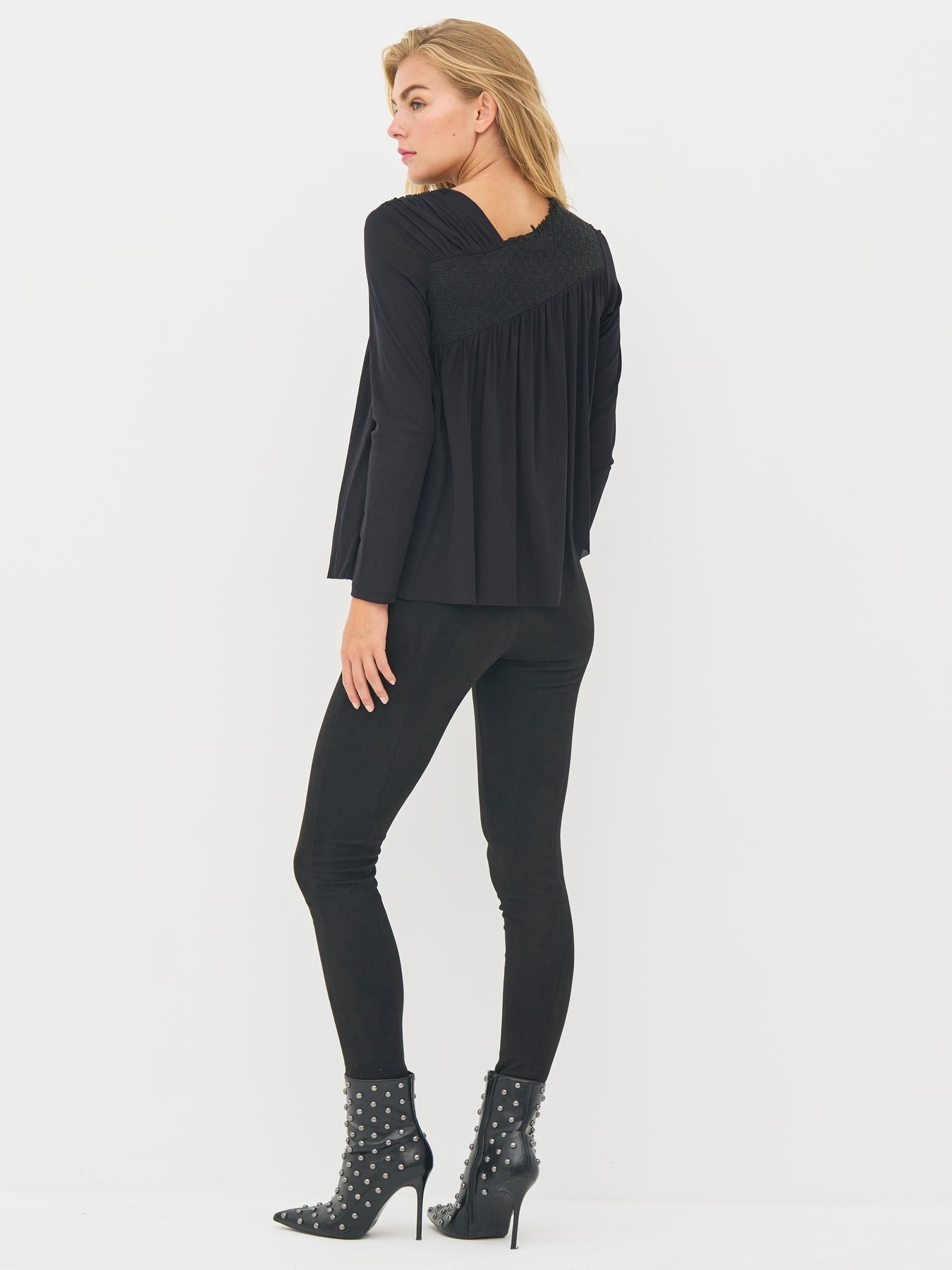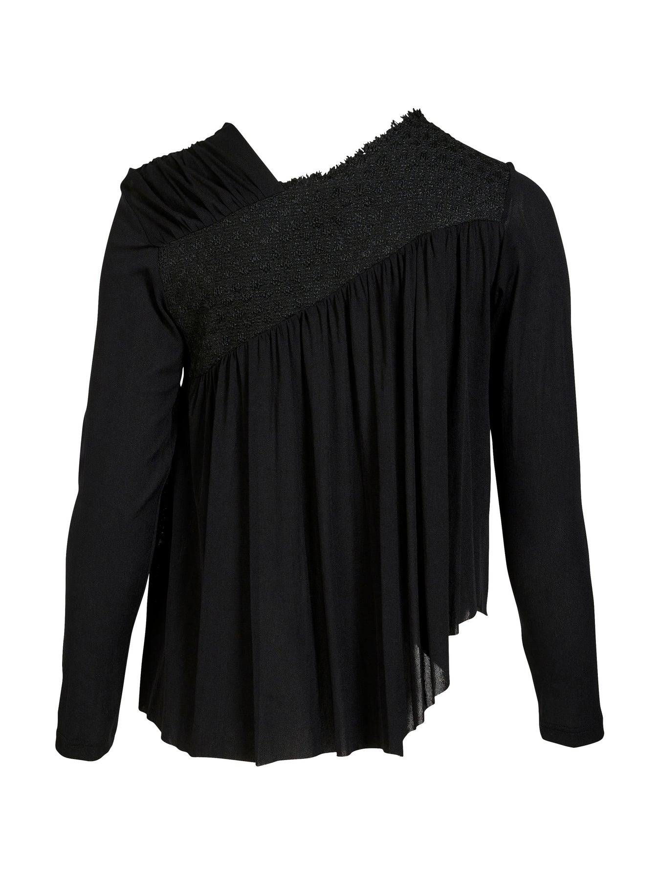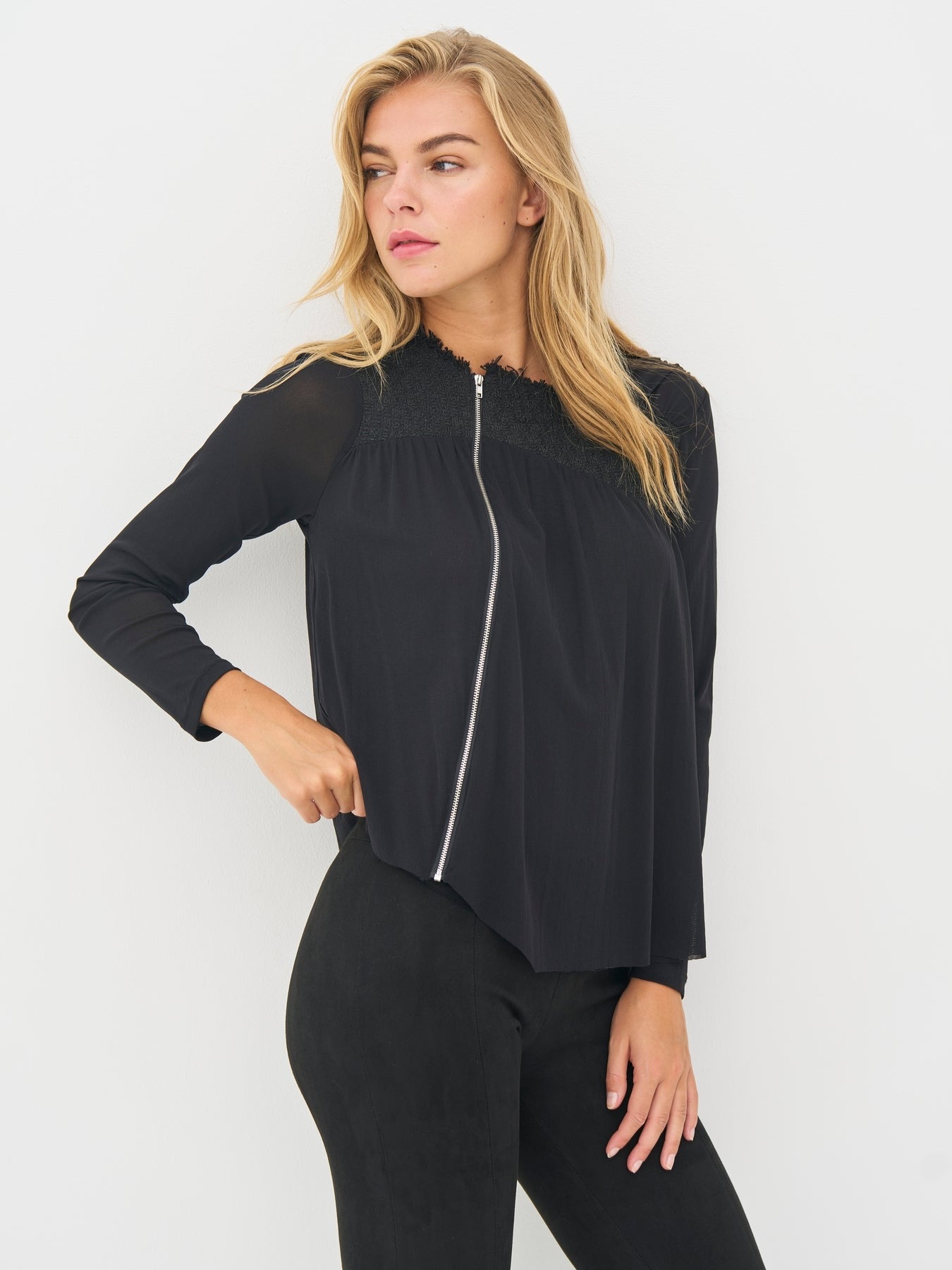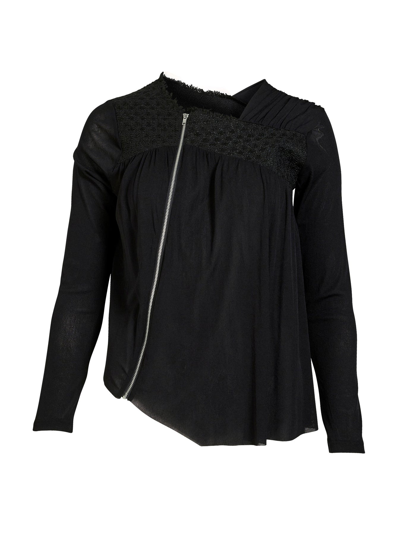 This blouse stands out with its asymmetrical zipper and exciting combination of textures. The top part features a structured fabric, creating a contrast to the light, pleated drape at the bottom.