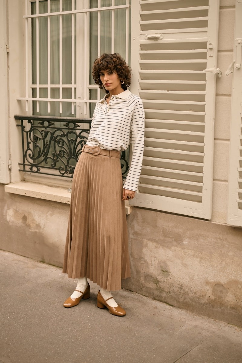 This pleated maxi skirt with a belted waist offers a relaxed fit and effortless style. The tailored silhouette and ankle-grazing length make it perfect for versatile, comfortable day-to-evening wear.