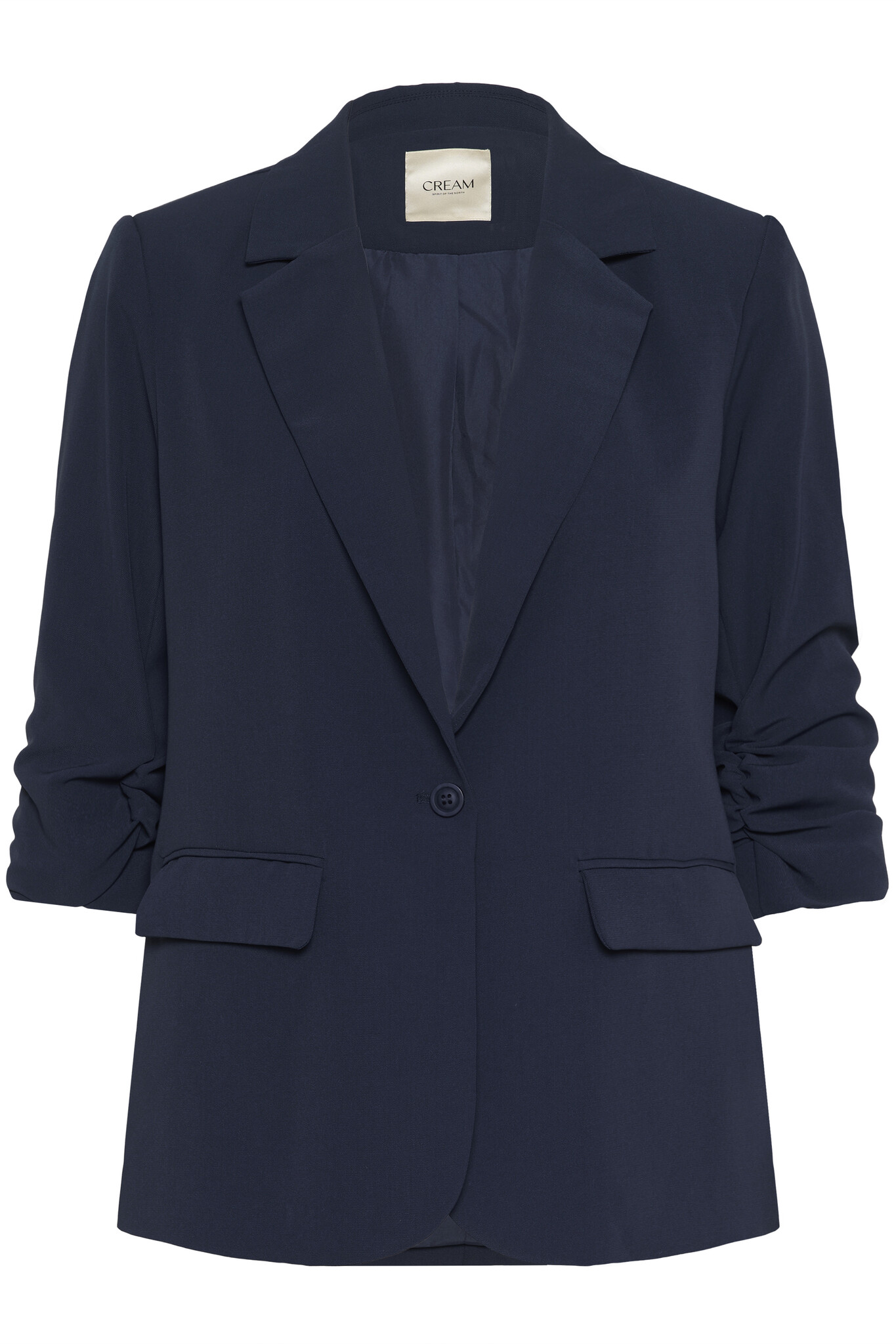 Tailored Blazer featuring a relaxed fit, ruched three-quarter sleeves, and classic lapel collar. Designed for versatility and comfort, this blazer is ideal for both business and casual occasions. A wardrobe essential for modern style.