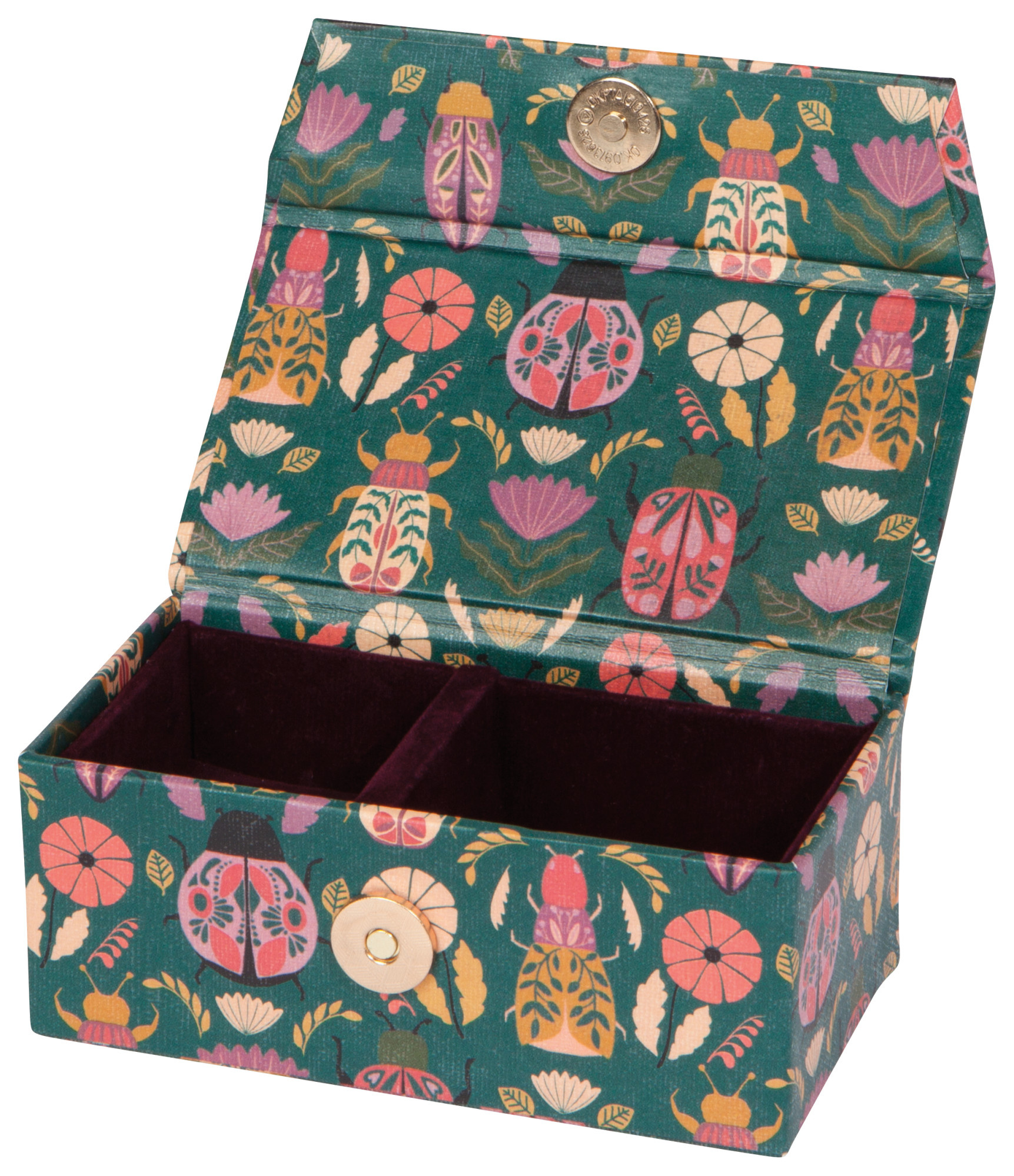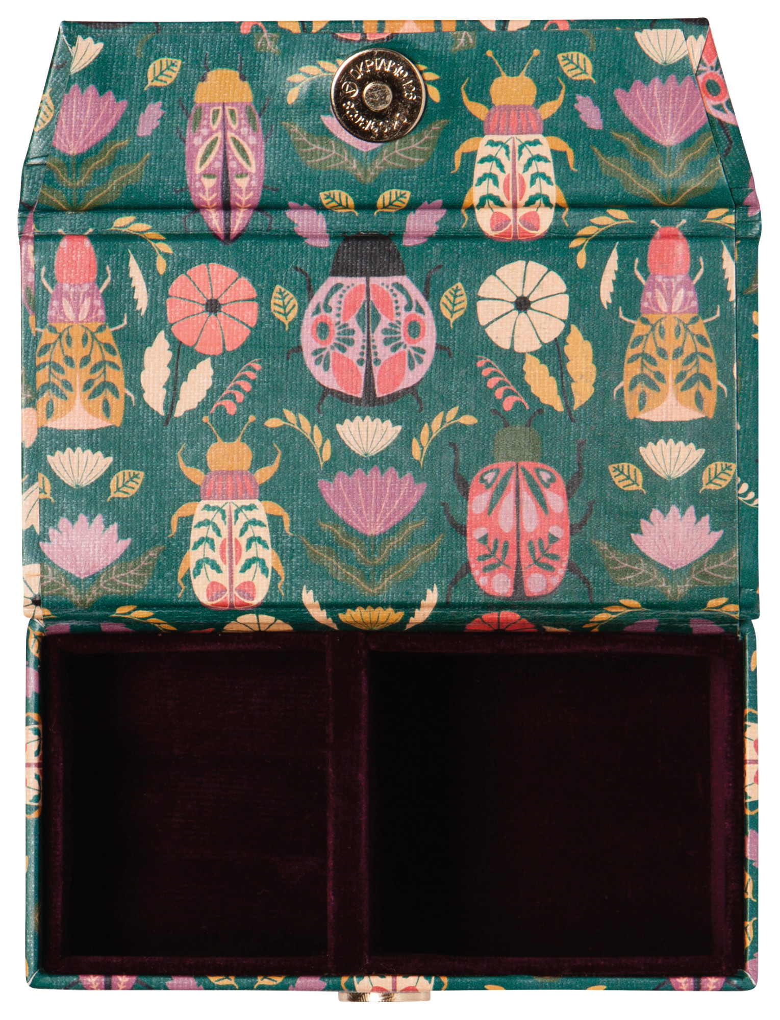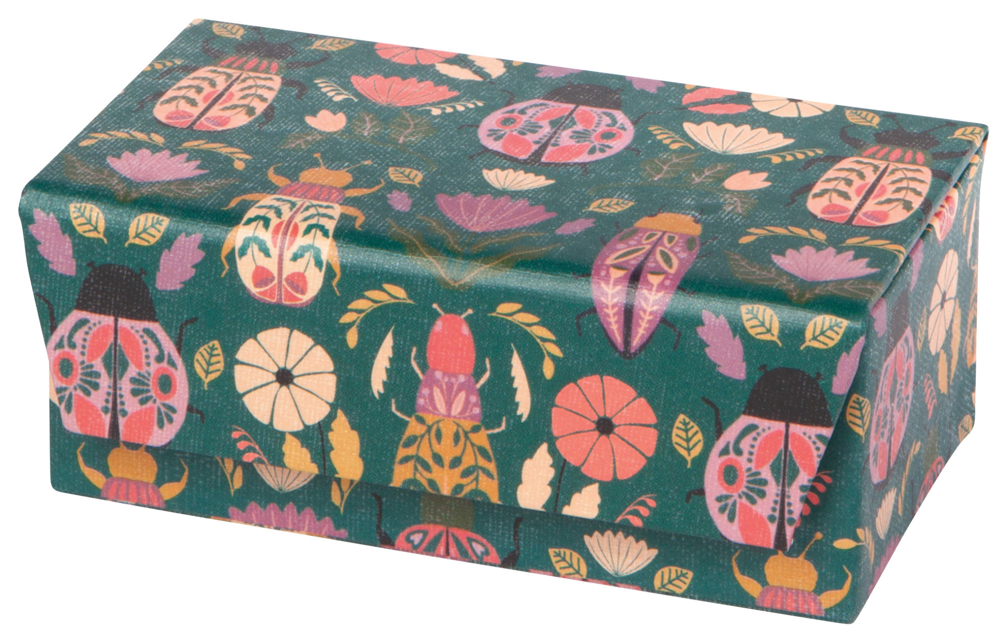 A sophisticated repository for your treasures in sleek emerald green, adorned with jewel-colored scarab beetles. This compact case is designed to accompany you on your journeys, providing a stylish sanctuary for your favorite pieces.