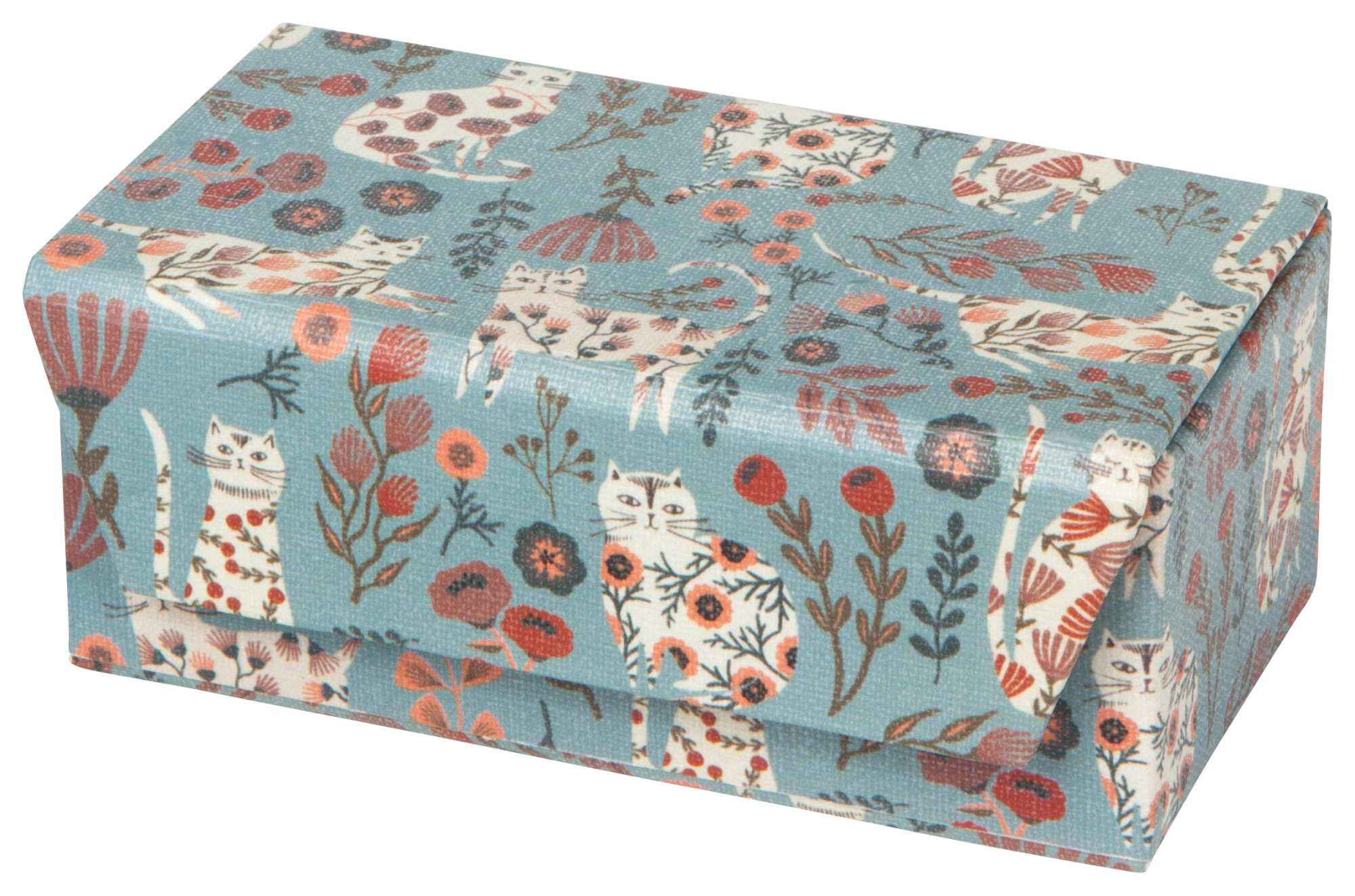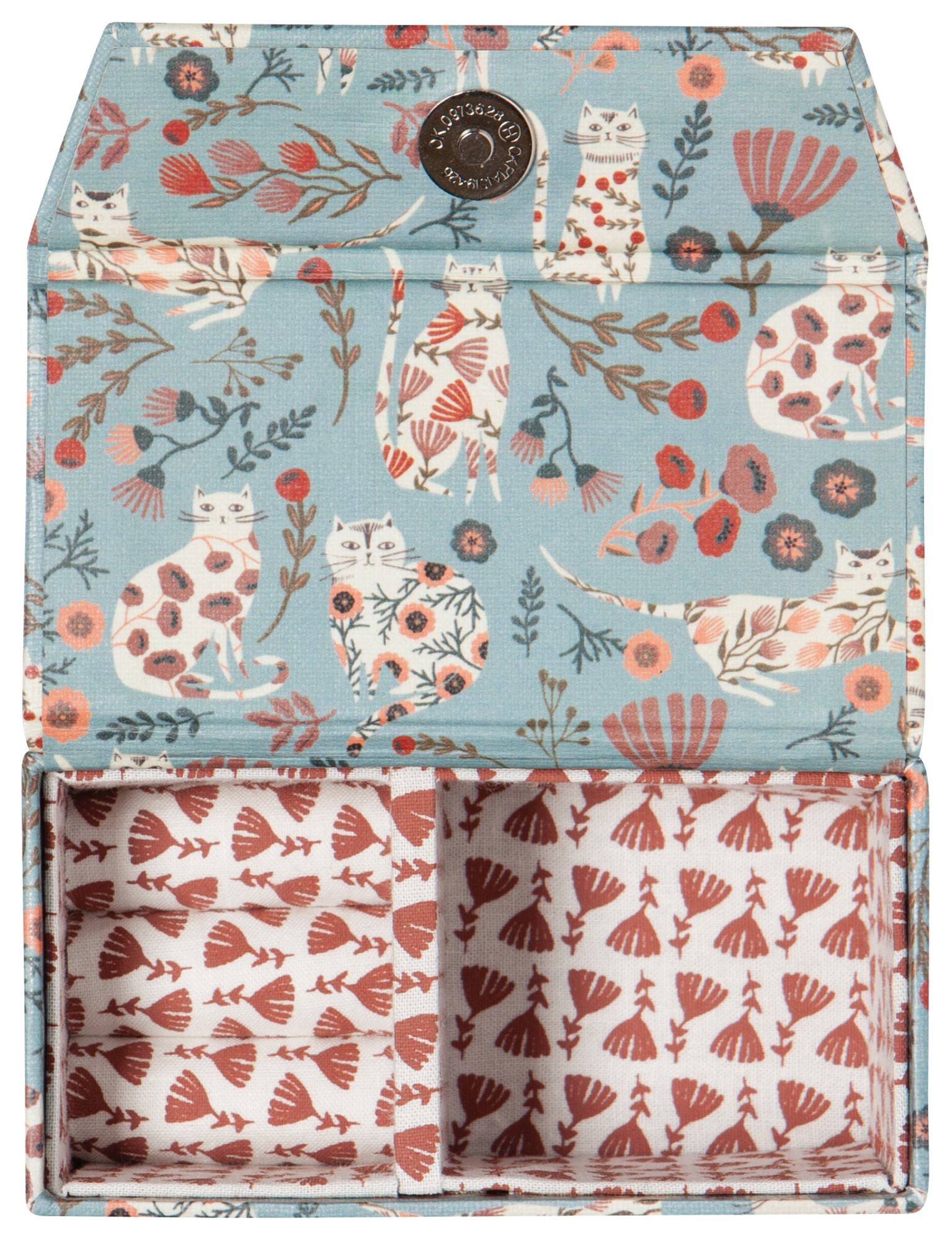 A charming light blue case adorned with whimsical white cats and delicate pink flowers. Perfect for organizing your jewelry on the go, this case combines practicality with the playful elegance of the Catbloom collection.