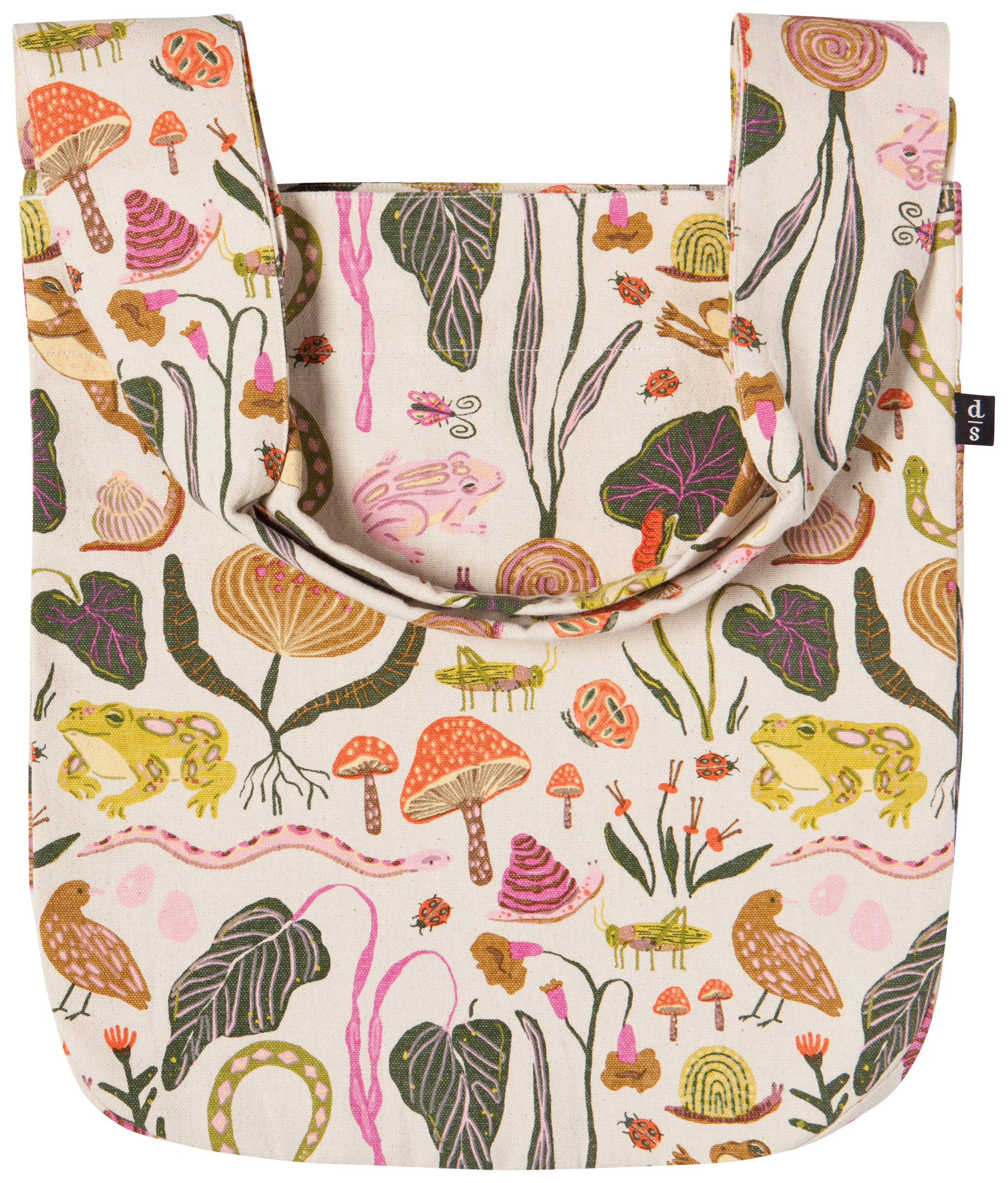 Featuring a lively medley of snails, snakes, mushrooms, and florals, its earthy greens and mushroom browns are punctuated by bold pops of pink and citron. Spacious and durable, it carries the beauty of the garden while keeping your essentials close at ha