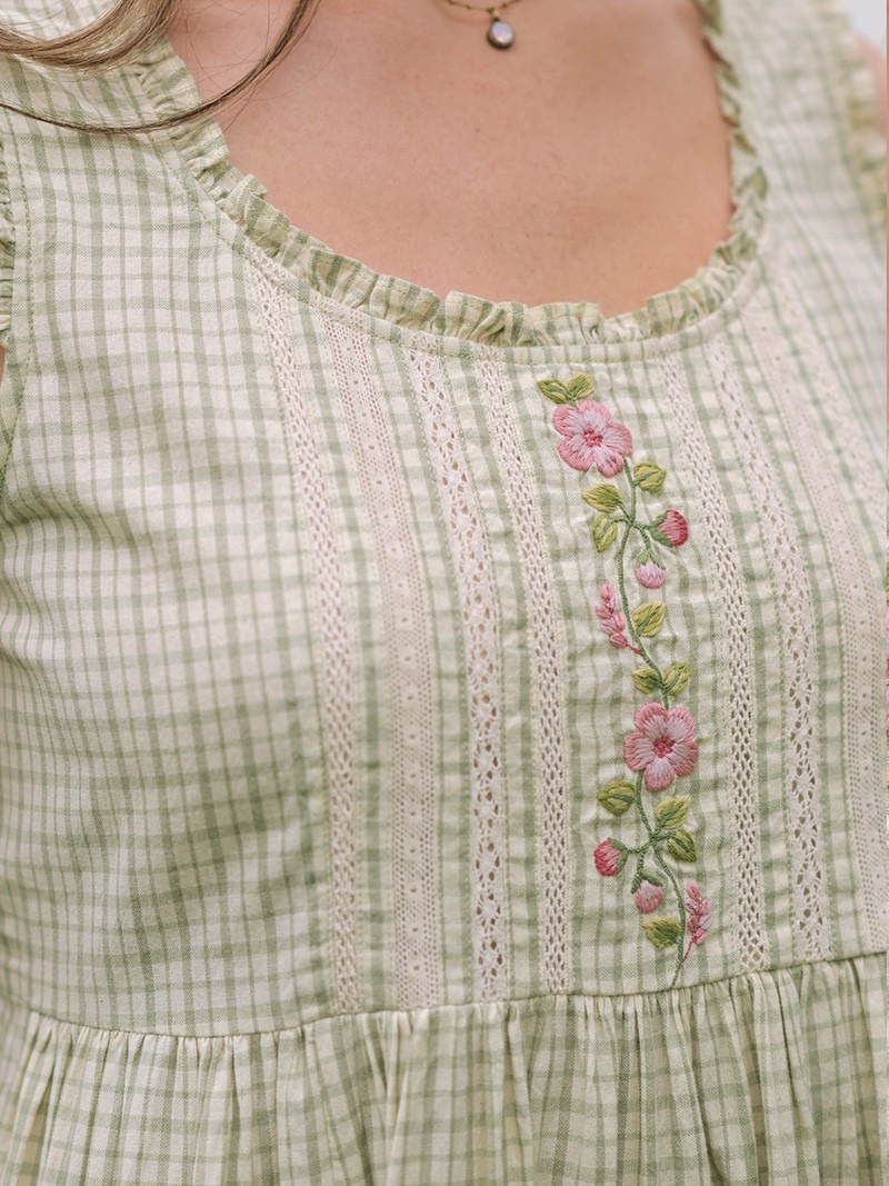 A soothing sage yarn-dyed cotton daydream, traced with a hand guided embroidered floral vine, petite ruffled neckline, gentle waist gathers, patch pockets, and button on ties - romance in motion.