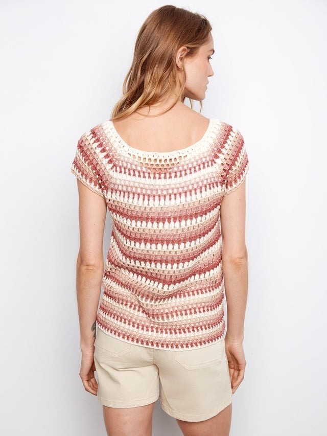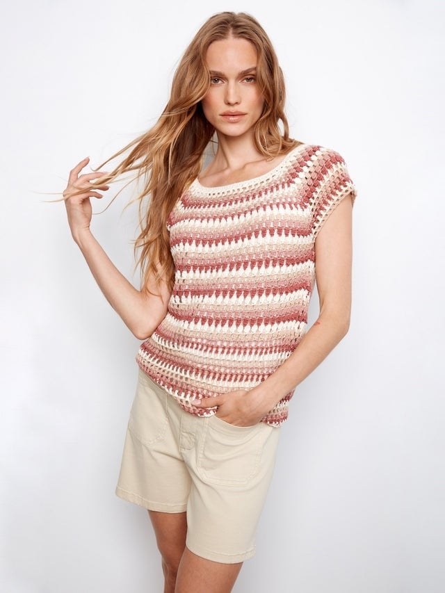 Elevate your spring wardrobe with this bohemian crochet top, featuring cap sleeves and a timeless boat neckline. Charming pink hues stripes add effortless versatility, making it easy to style with any outfit, an essential piece for a polished, modern look...