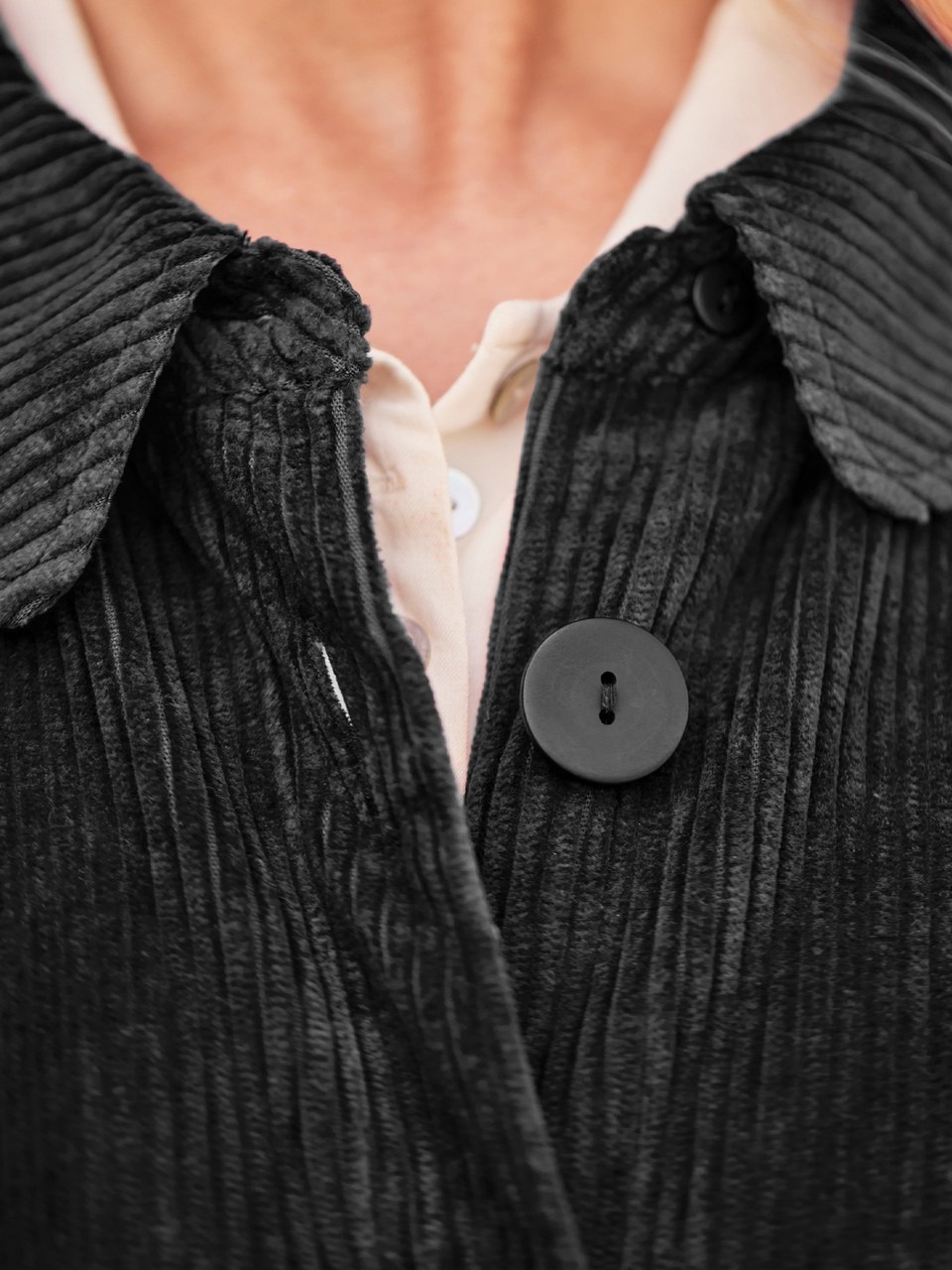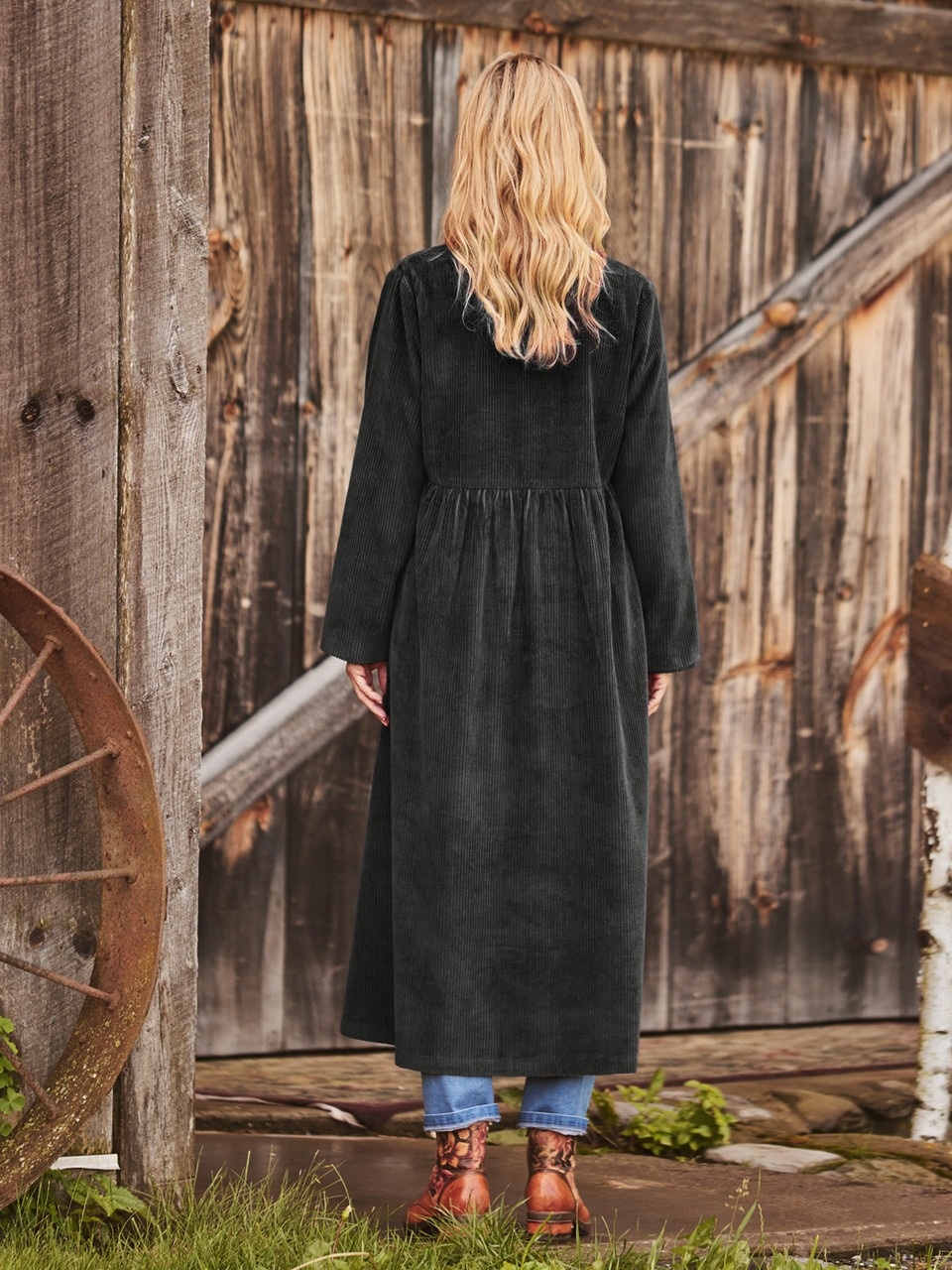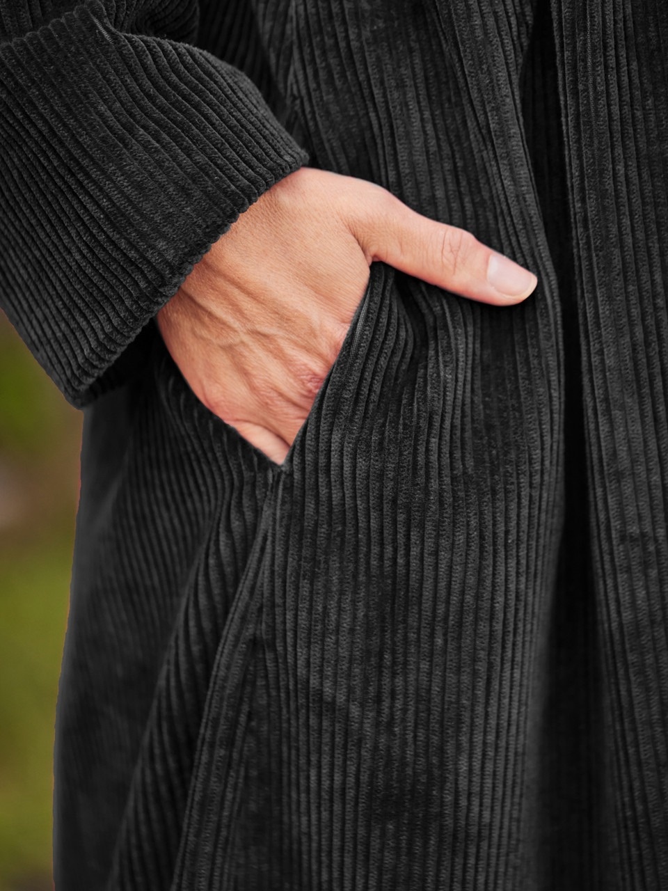 A magnificent long corduroy jacket with flowing gathers, oversized chalk buttons and pockets for good measure. Inside? A smooth and silky contrast lining that delights every time.