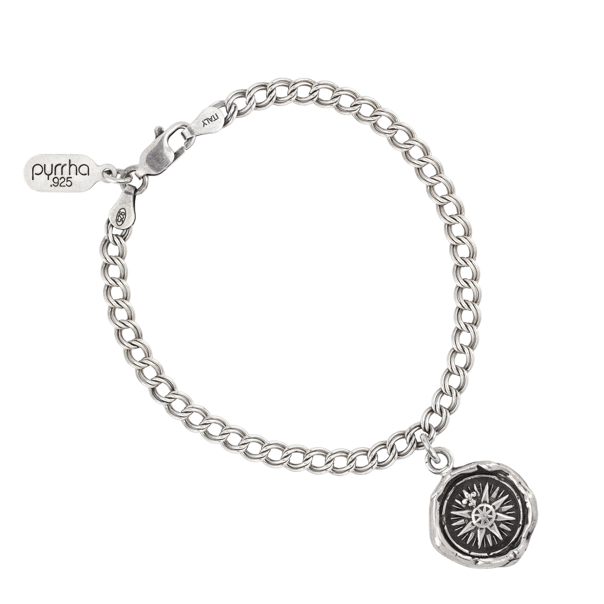 - Sterling silver or bronze talisman charm fixed on a sterling silver charm bracelet chain with a Pyrrha branded quality tag.