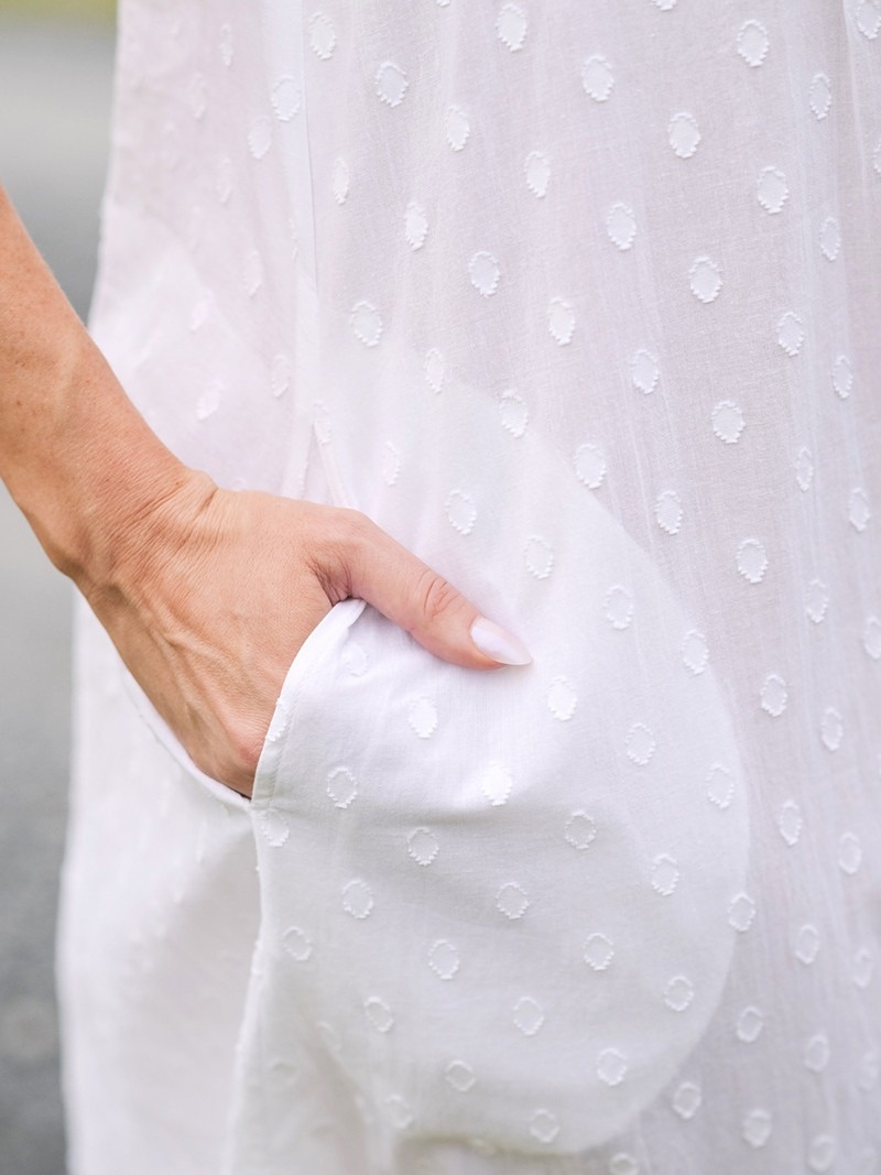 A lovely cotton swiss dot nighty adorned with pintuck pleats, a petite ruffled neckline, mother of pearl buttons, and pockets - softness stitched into every gentle detail.