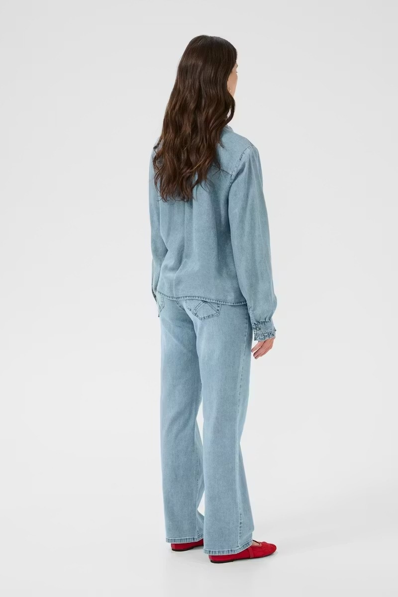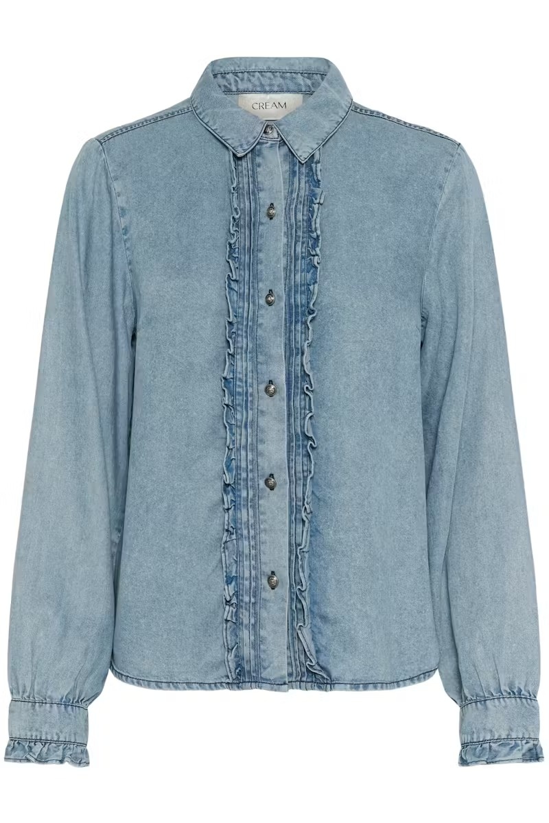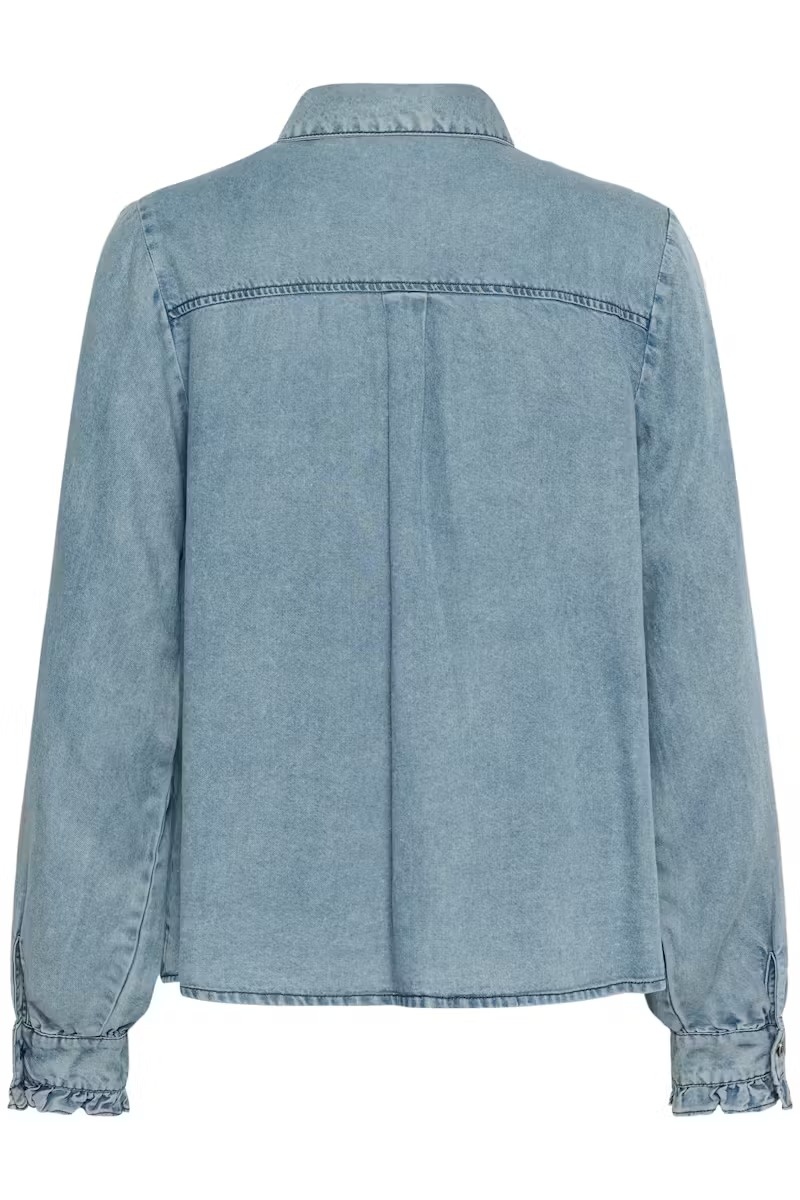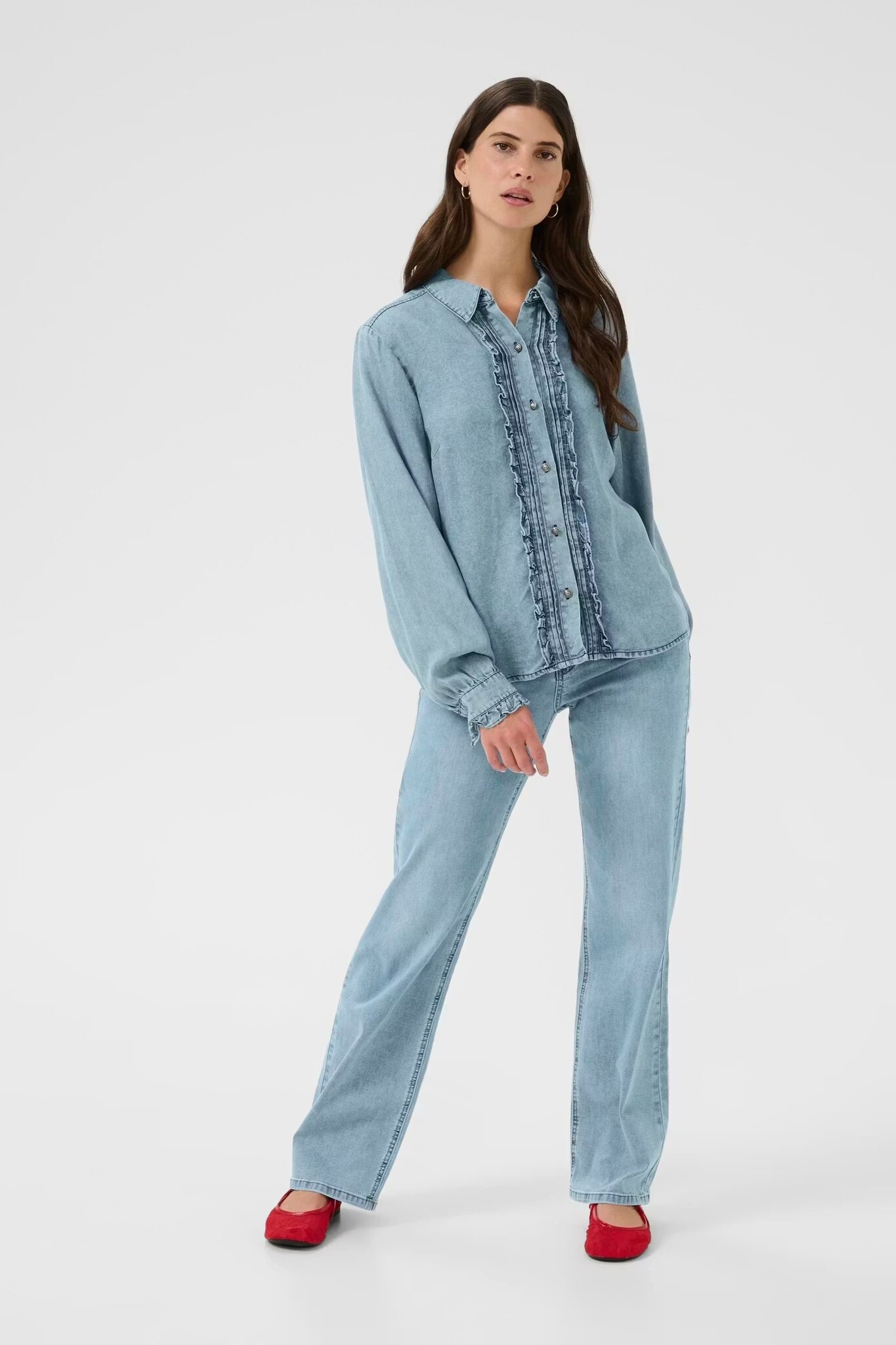 This women's denim blouse features a regular fit, classic shirt collar, and delicate front ruffle detail. Designed with long sleeves and button closure, this blouse blends comfort and versatile style for everyday wear.
