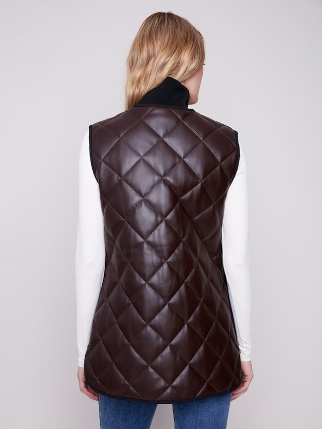 Upgrade your fall wardrobe with our long quilted faux leather vest in rich brown mocha. Cozy yet stylish, this versatile sleeveless jacket elevates every outfit, making it a must-have for trendsetters.