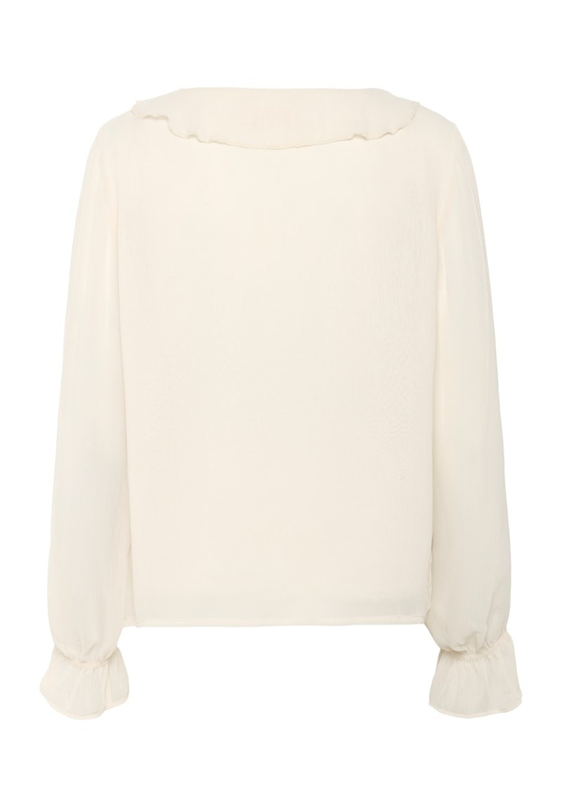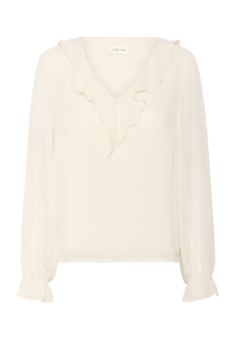 This long-sleeve blouse features a soft, semi-sheer finish and a fluid silhouette. Designed with a V-neckline accented by a subtle ruffle trim and gathered cuffs for added detail.