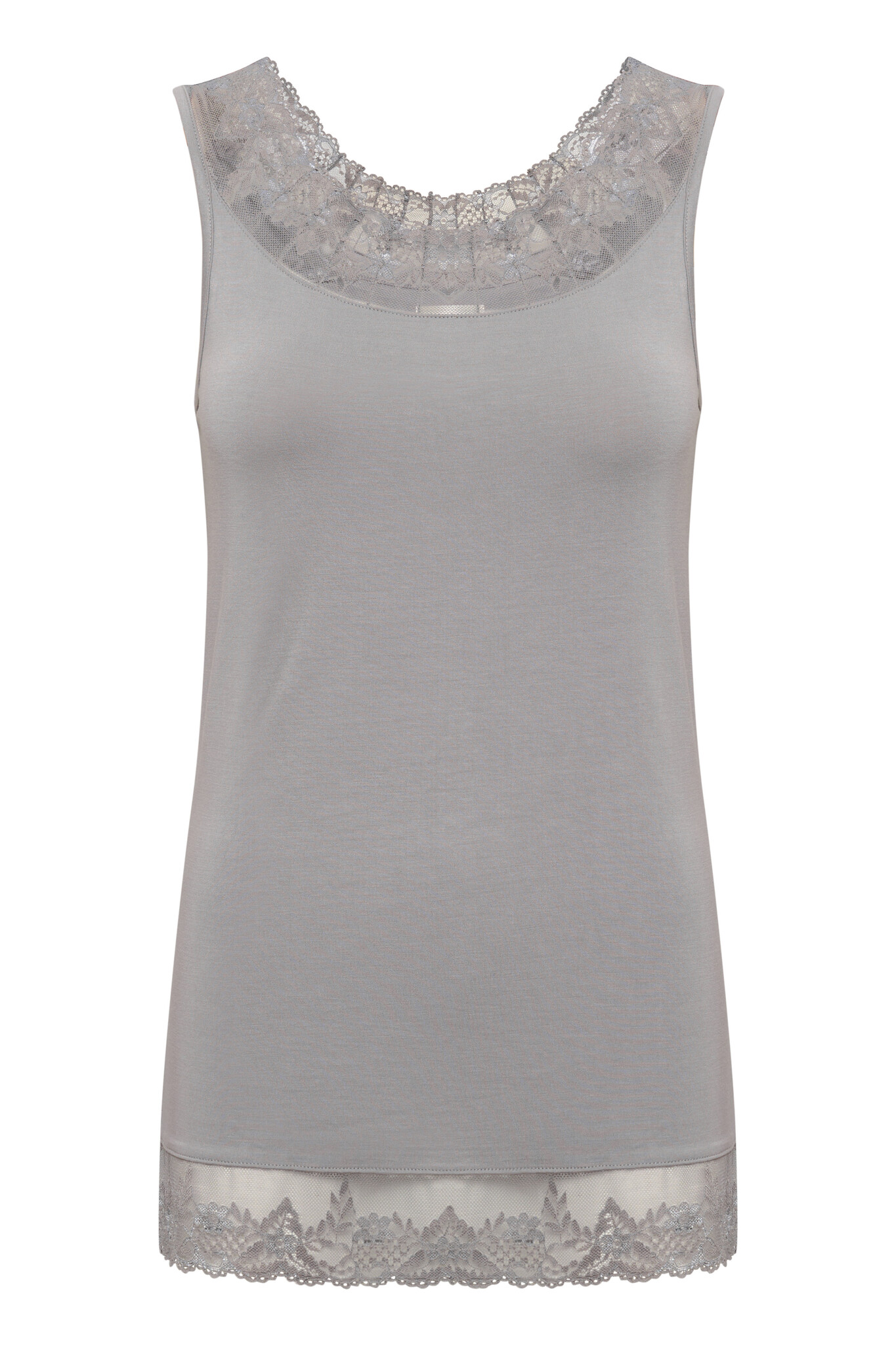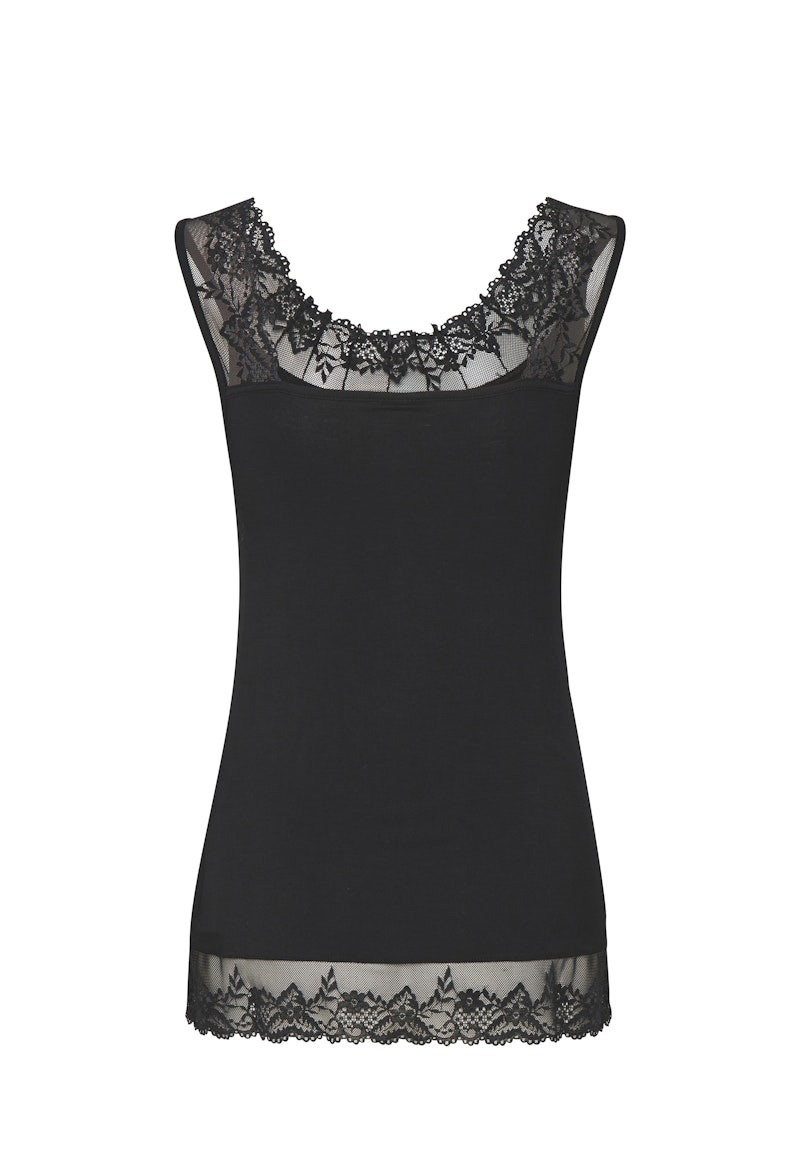 Lace trim tank top featuring a soft, smooth finish and fitted silhouette. Sheer lace details at the neckline and hem add stylish texture and a modern edge.