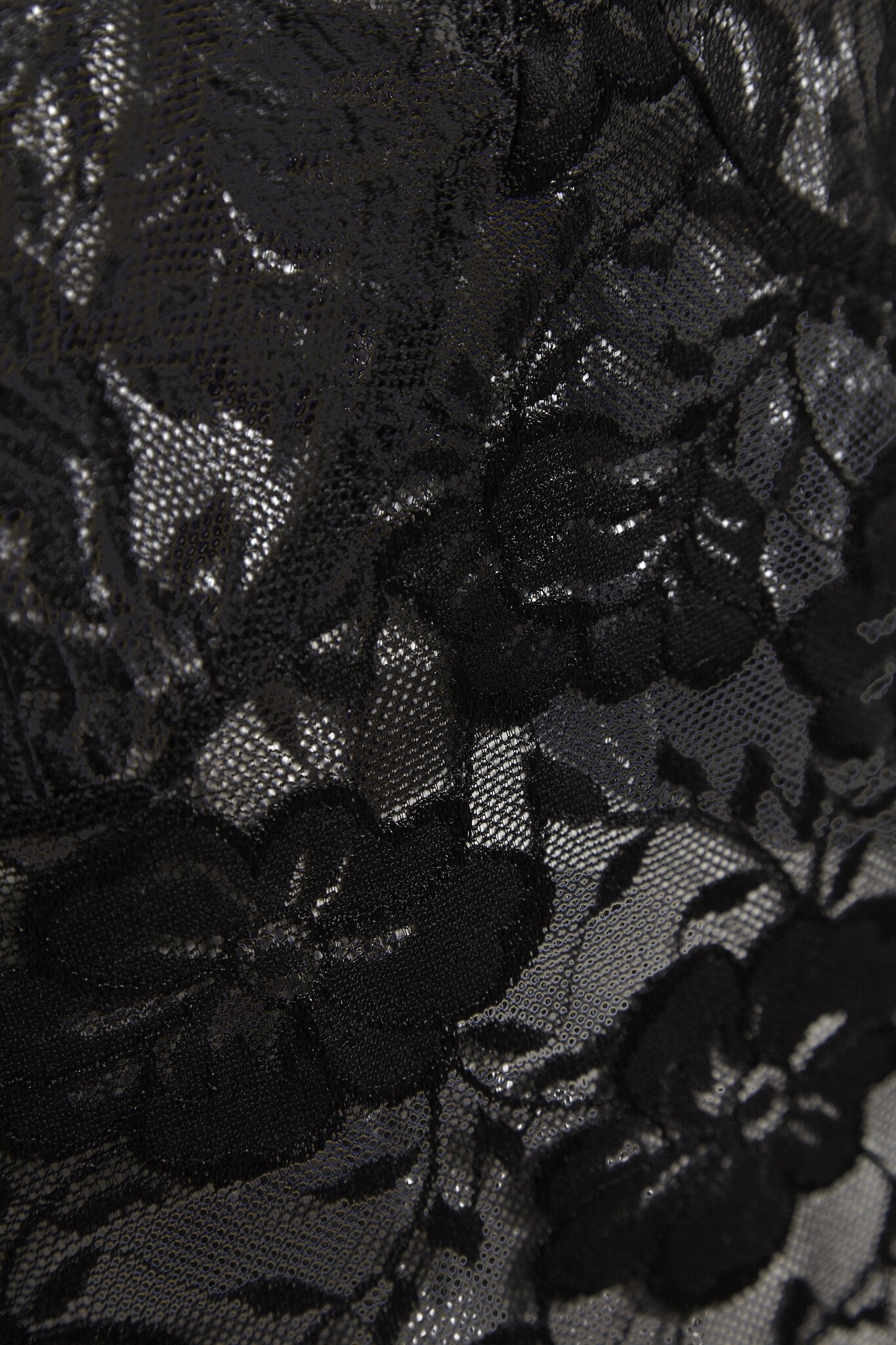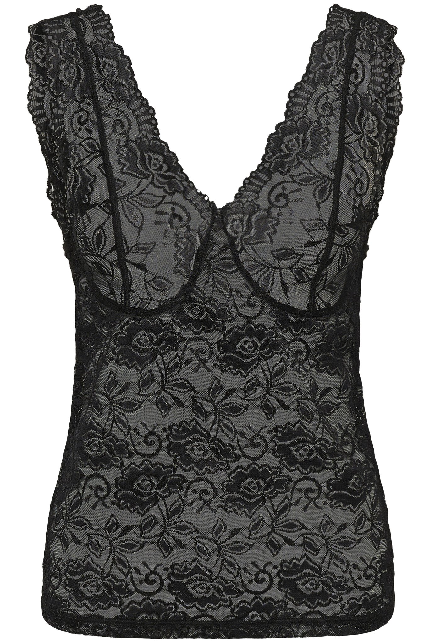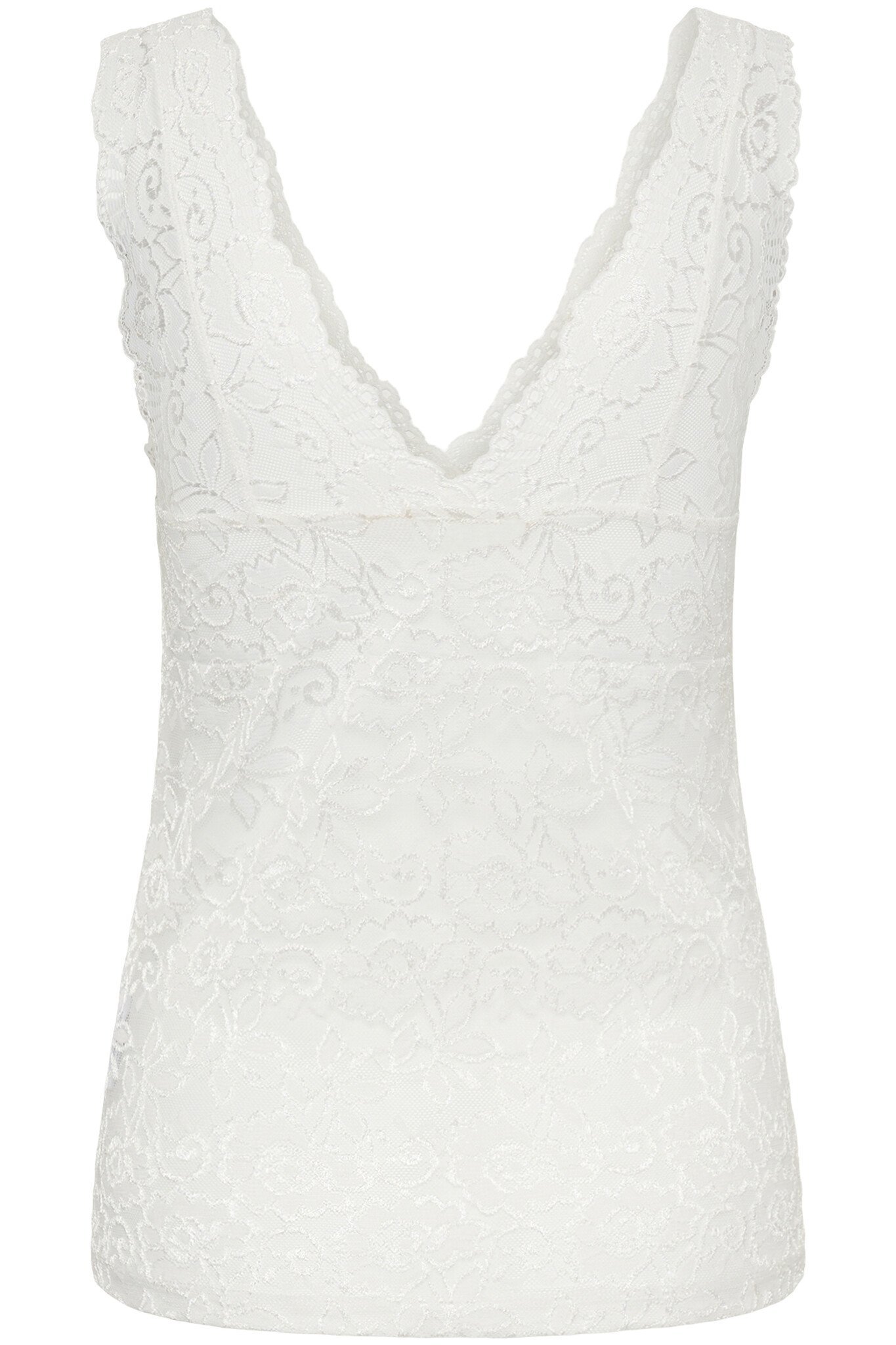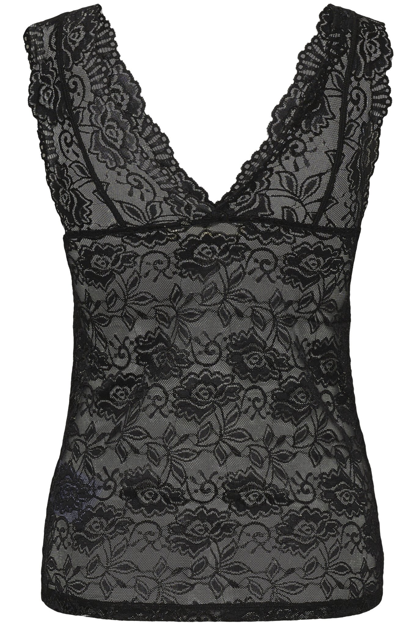 Lace tank top features a fitted silhouette with a deep V-neckline, sheer floral lace texture, scalloped edges, and sleeveless design. Delicate lace throughout for a refined statement.