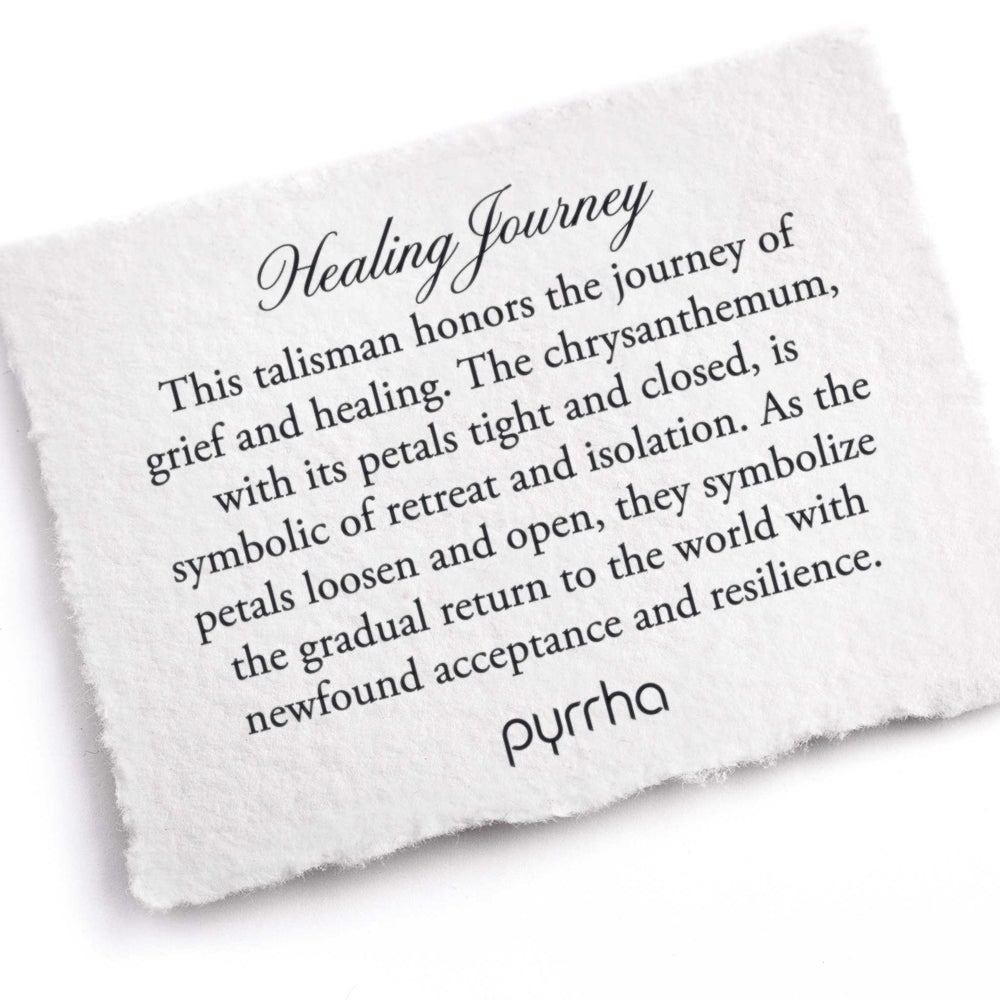This talisman honors the journey of grief and healing. The chrysanthemum, with its petals tight and closed, is symbolic of retreat and isolation. As the petals loosen and open, they symbolize the gradual return to the world with newfound acceptance and re...