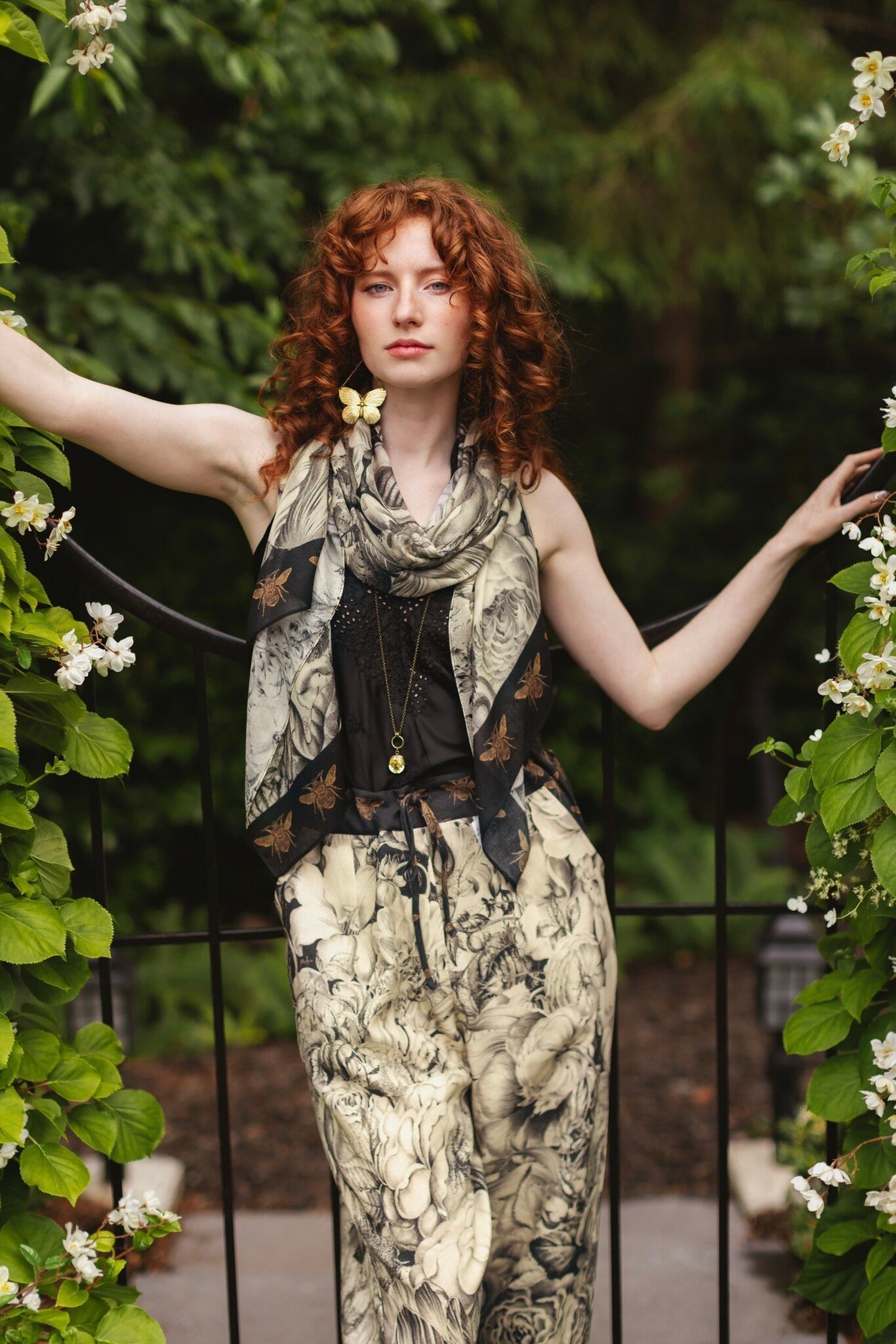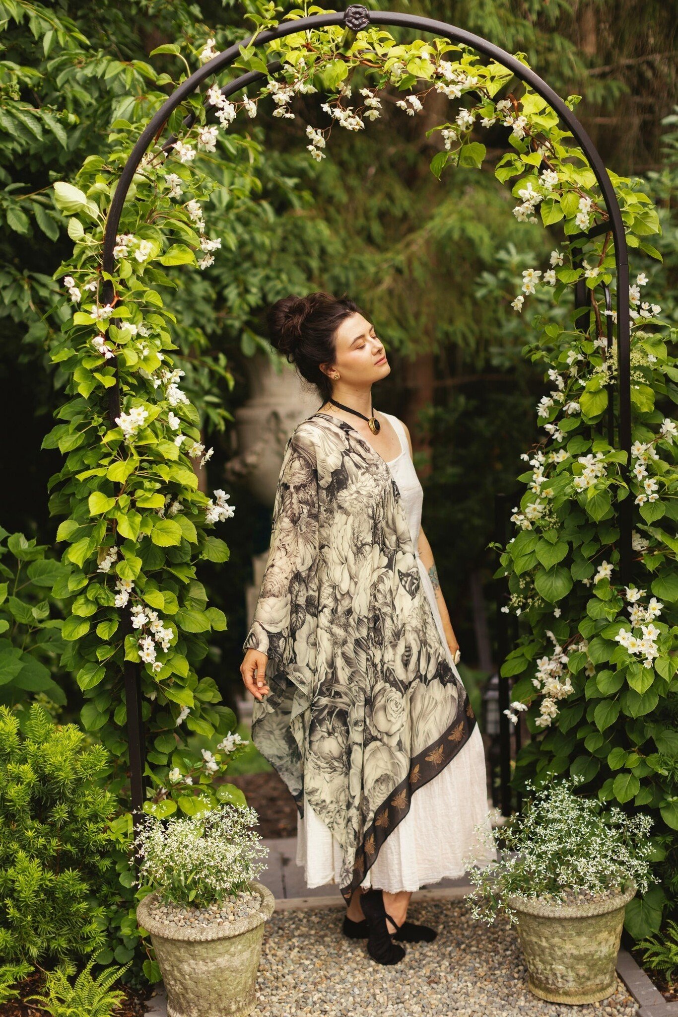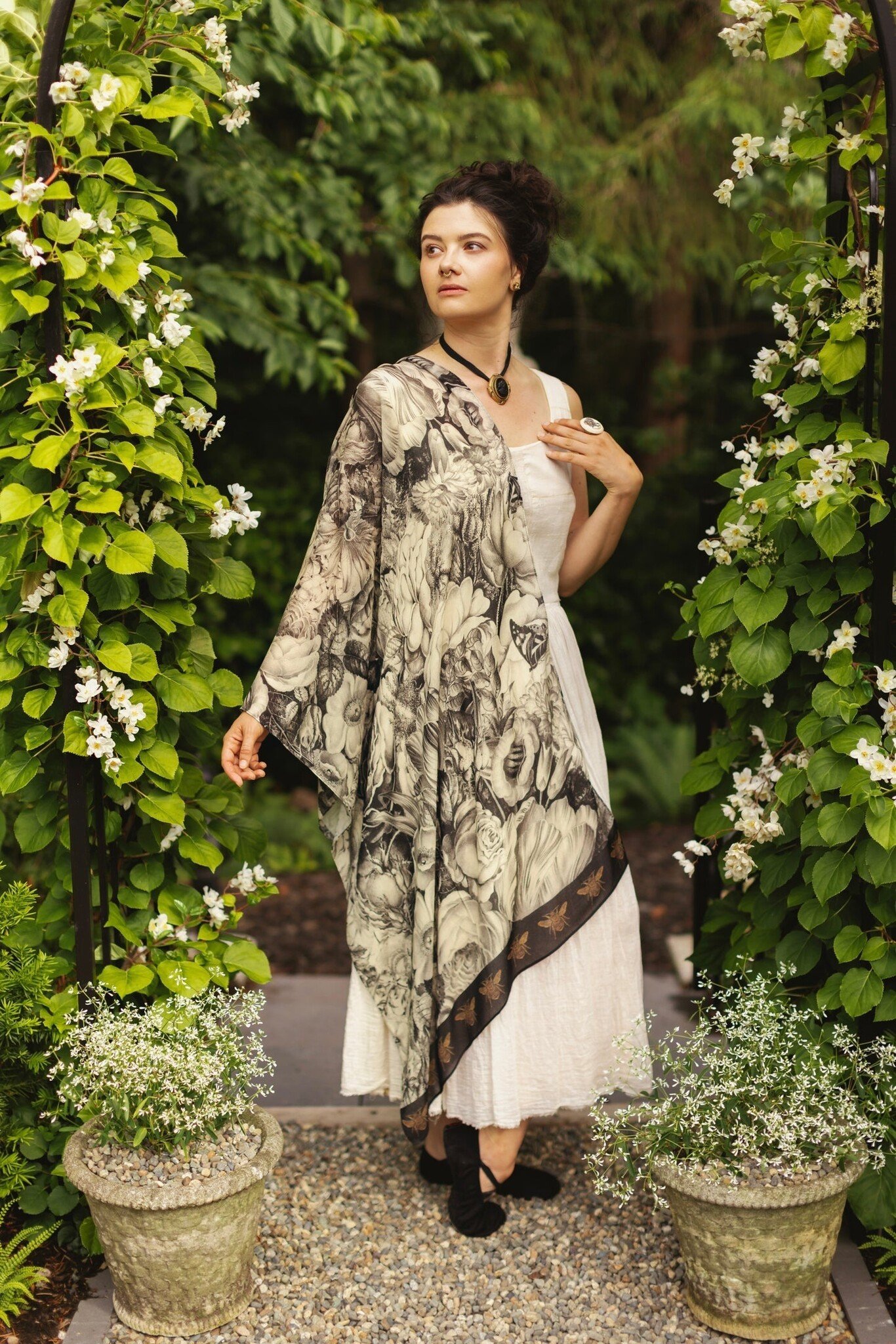 Inspired by the black-and-antique ivory palette of our little studio and house (styled after a New England church and a century-old general store), this romantic floral design draws from a tangle of 19th-century lithographs — a garden dreamt up in ink. Scattered with golden bees borrowed from an embossed Victorian book cover, it’s both grounded and celestial: a pattern that feels like moonlight through old glass, or vines climbing weathered wood.