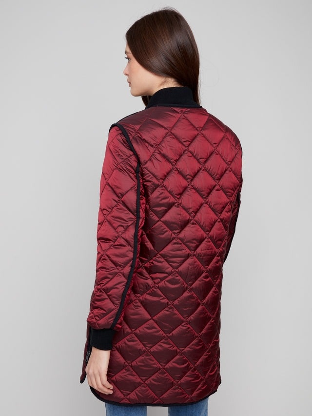 Keep warm and stylish with this cabernet red long quilted puffer jacket. The rib knit collar and cuffs add elegance, while the zipper-front closure offers practicality. With its sophisticated quilted design and side pockets, this jacket is the perfect cri...