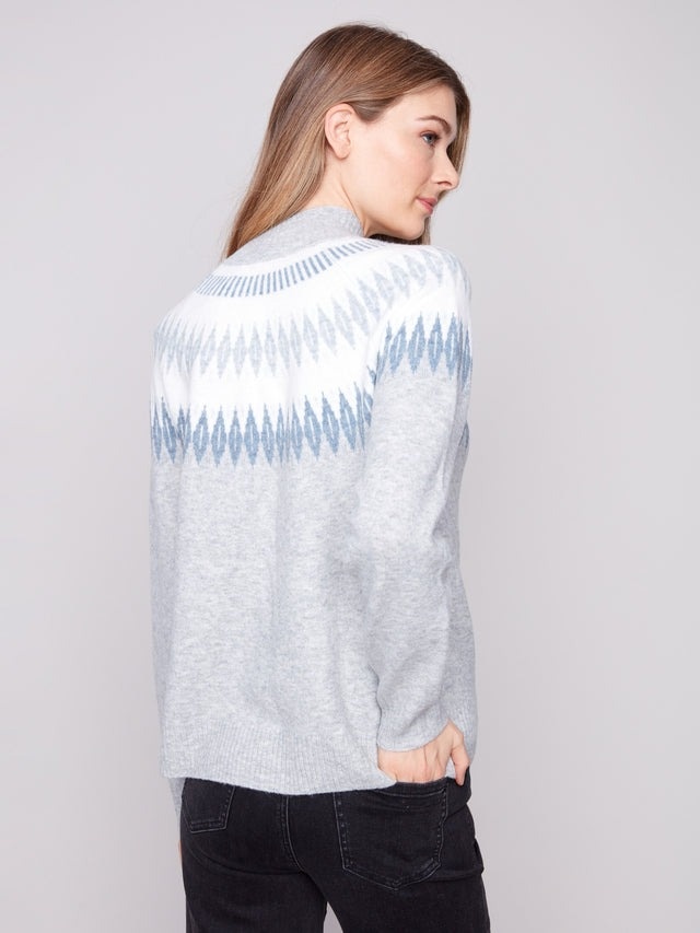 Embrace winter wonderland style with our Apres-Ski Heather Light Grey Sweater. Featuring a stylish mock neck and detailed jacquard design in blue and white, it's essential for your cold-weather wardrobe.