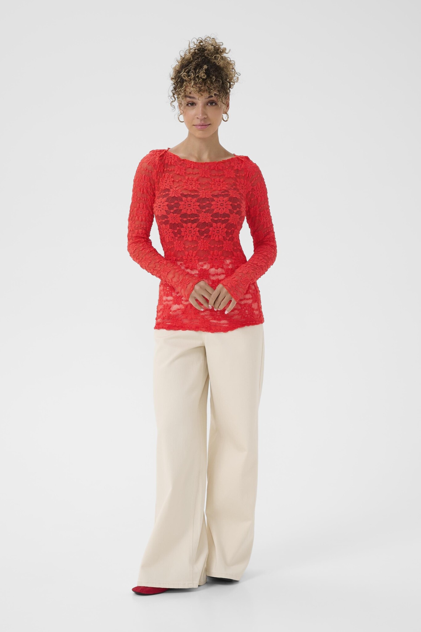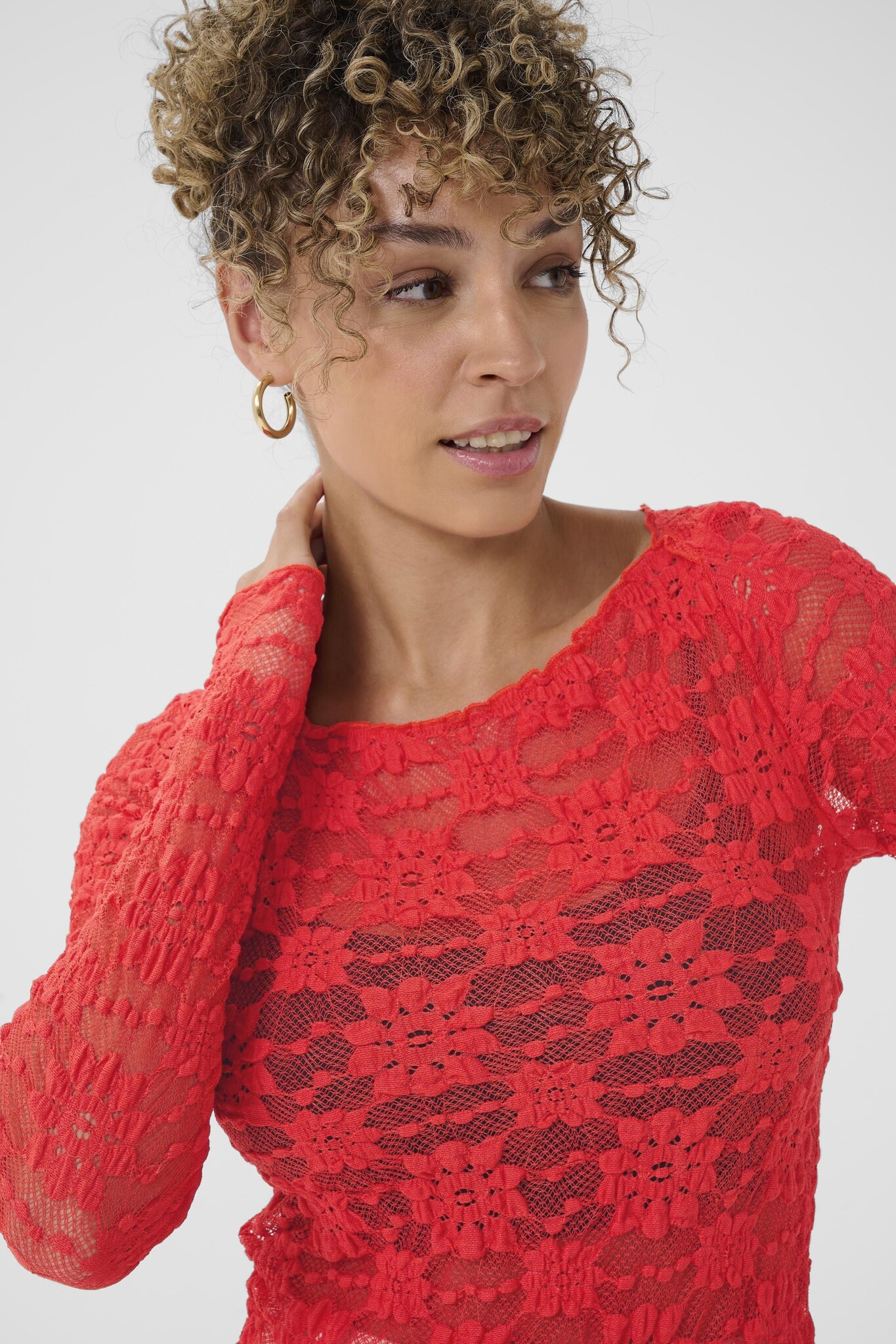 Lace long sleeve top with a close fit, semi-sheer floral design, and a classic crew neckline. Soft stretch material ensures comfort. Suitable for layering or wearing alone for versatile, modern style.
