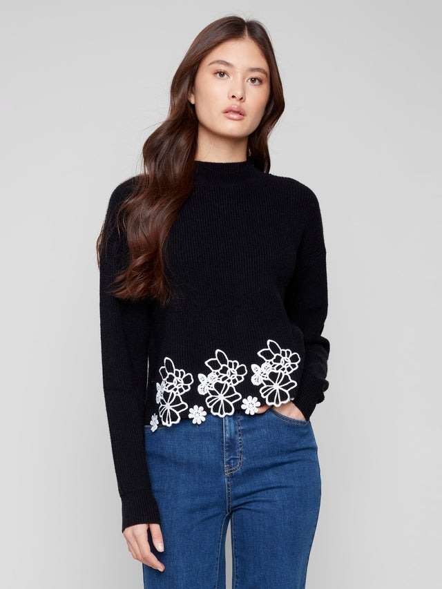 Show off your elegance with this refined black sweater. Its mock neck and drop shoulders create a modern silhouette, while the white floral lace hem adds a delicate, charming touch. Combining comfort and style, it’s perfect for any occasion.