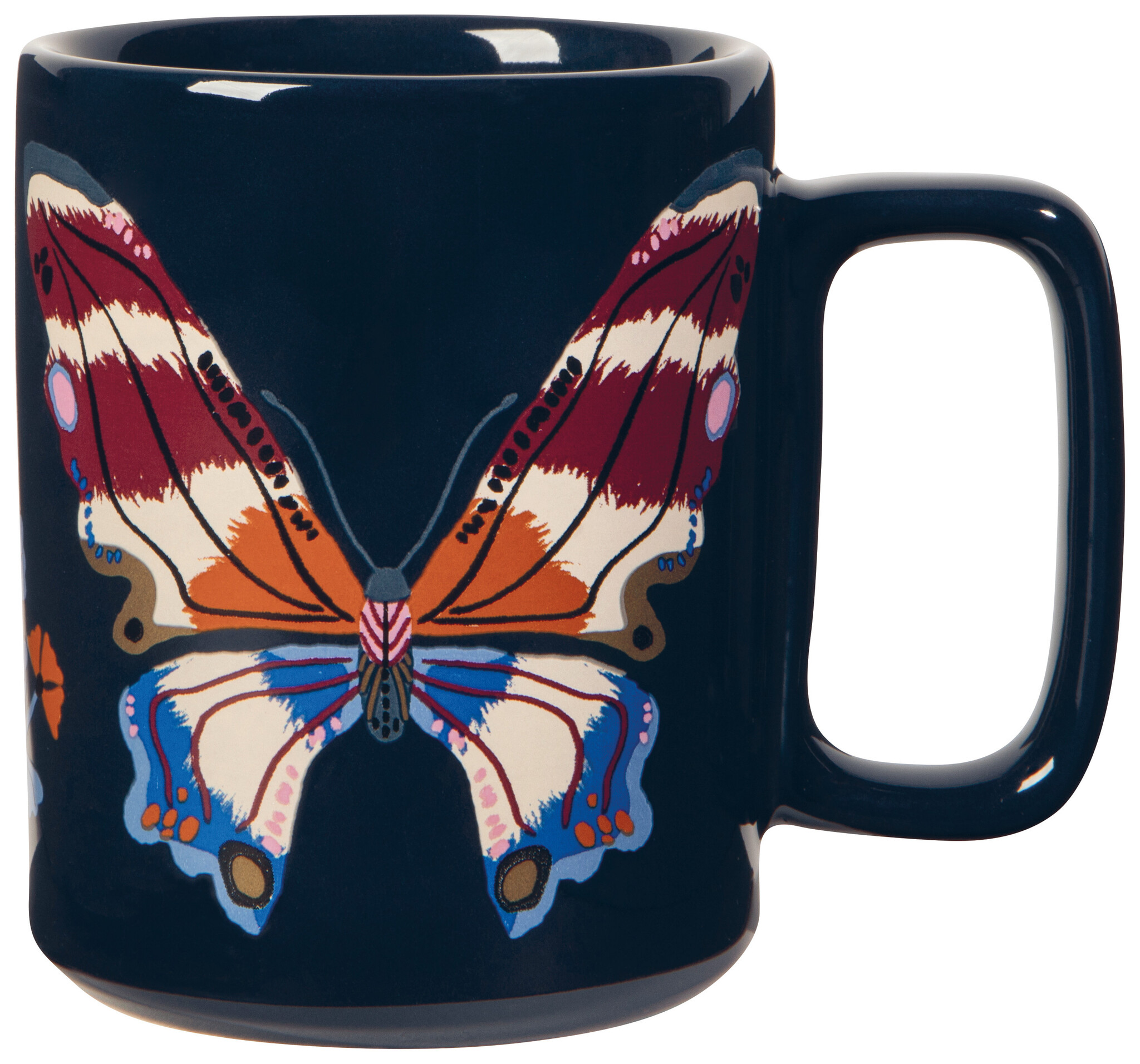 This modern Aurora studio mug features a unique rectangular handle. Spring dawns and a sunrise of color graces the butterflies wings with this design from the Aurora collection.
