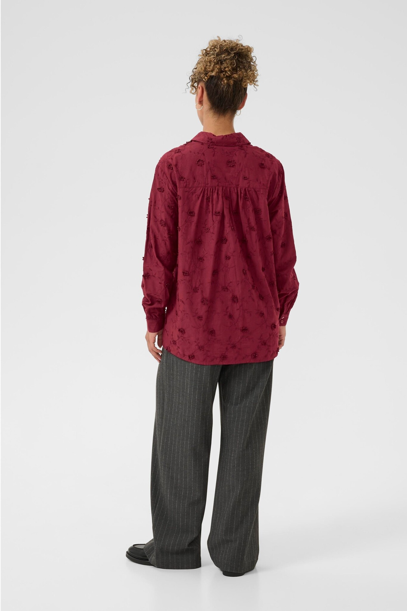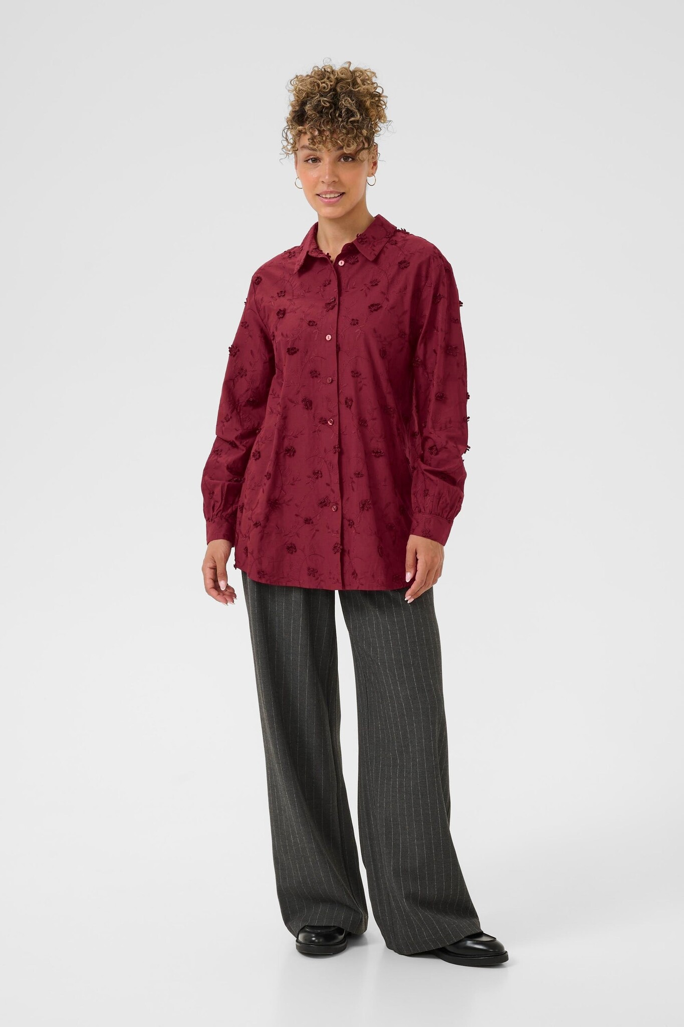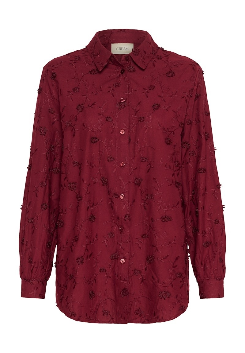 Blouse with relaxed fit, classic collar, and full-length sleeves. Subtle 3D embroidery adds texture. Versatile shirt style offers comfort and refined detail for work or casual occasions. Button front closure for easy wear.