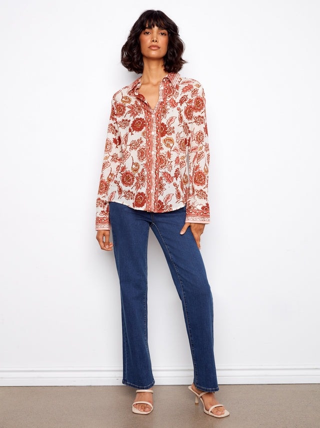 Refresh your spring wardrobe with our Printed Cotton Voile Button-Up Blouse, adorned with a beautiful floral print in vibrant shades of red that flows gracefully across the fabric.