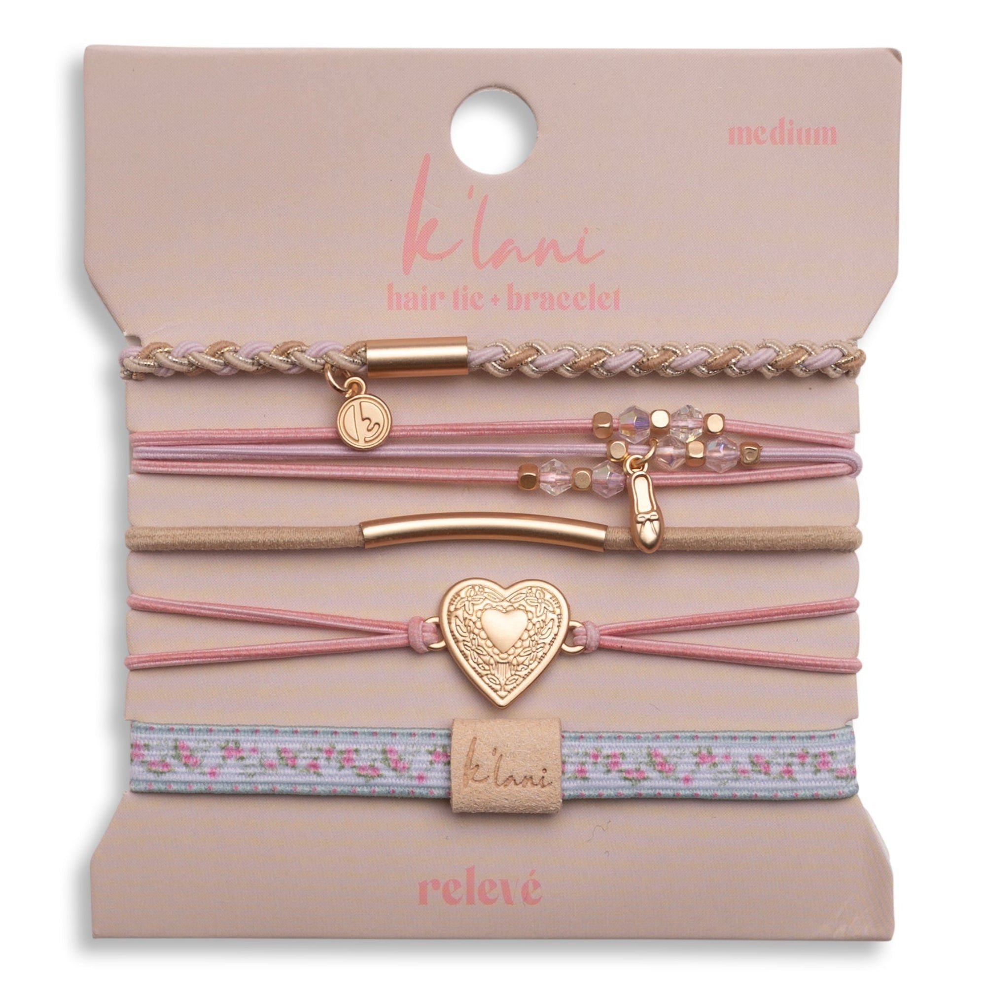 The Relevé set is inspired by the grace, strength, and beauty of ballet. These 5 hair tie bracelets feature soft, dainty pink tones accented with delicate florals and warm gold details. Finished with a sweet gold heart and mini slipper charms.