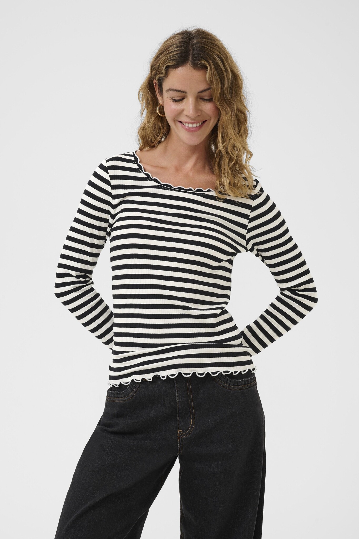 This women's long-sleeve top offers a slim fit and classic crew neckline, featuring ribbed fabric for comfort. Delicate lettuce-edge trims enhance the feminine look, ideal for casual and layered looks.