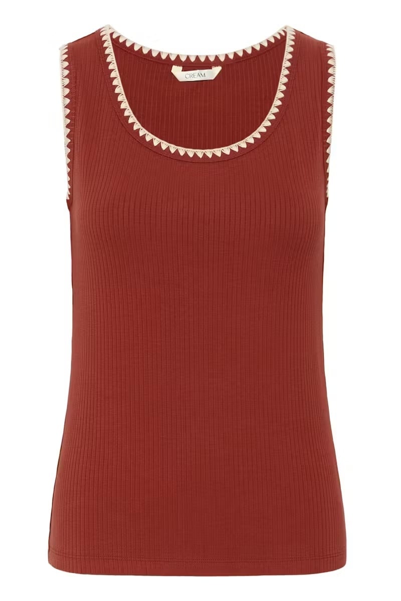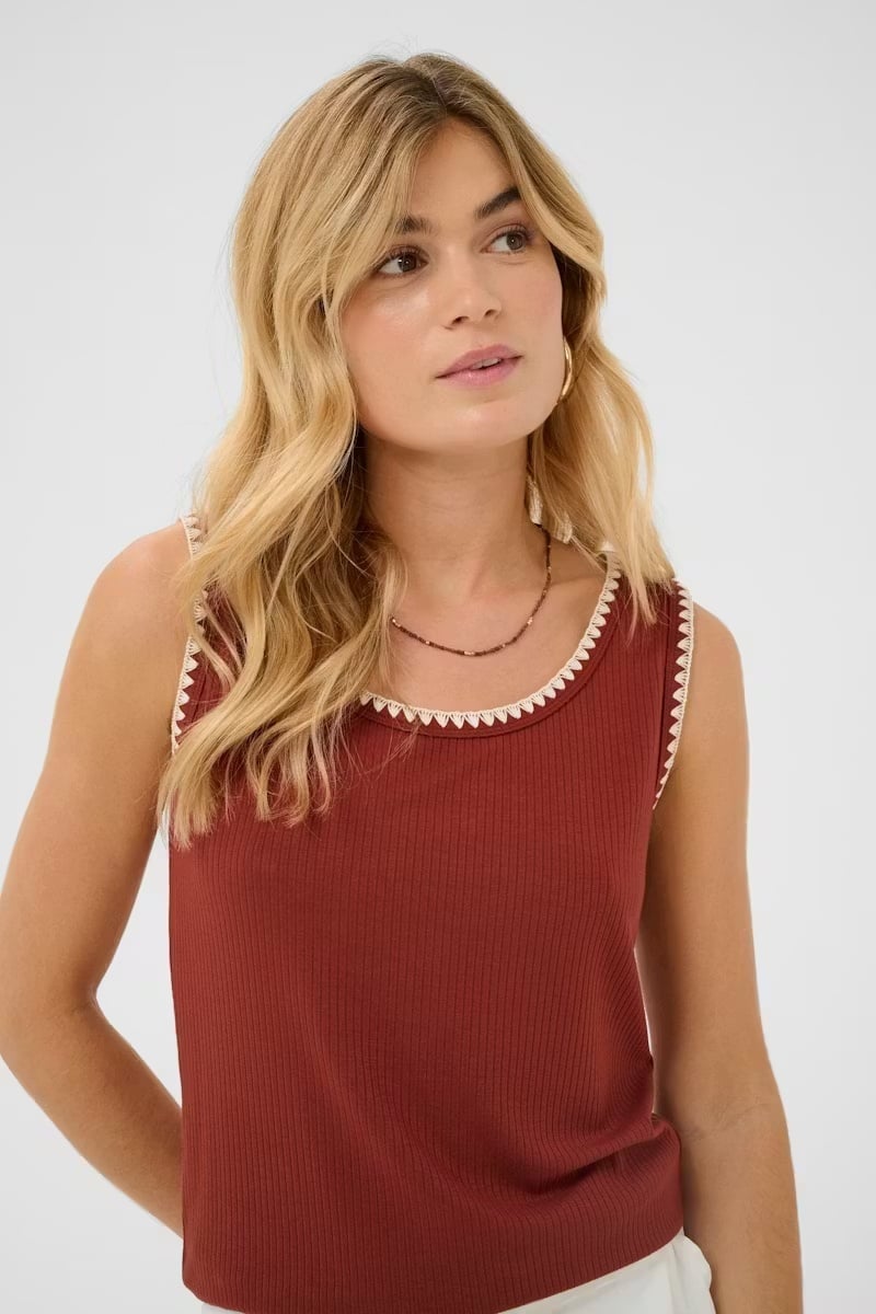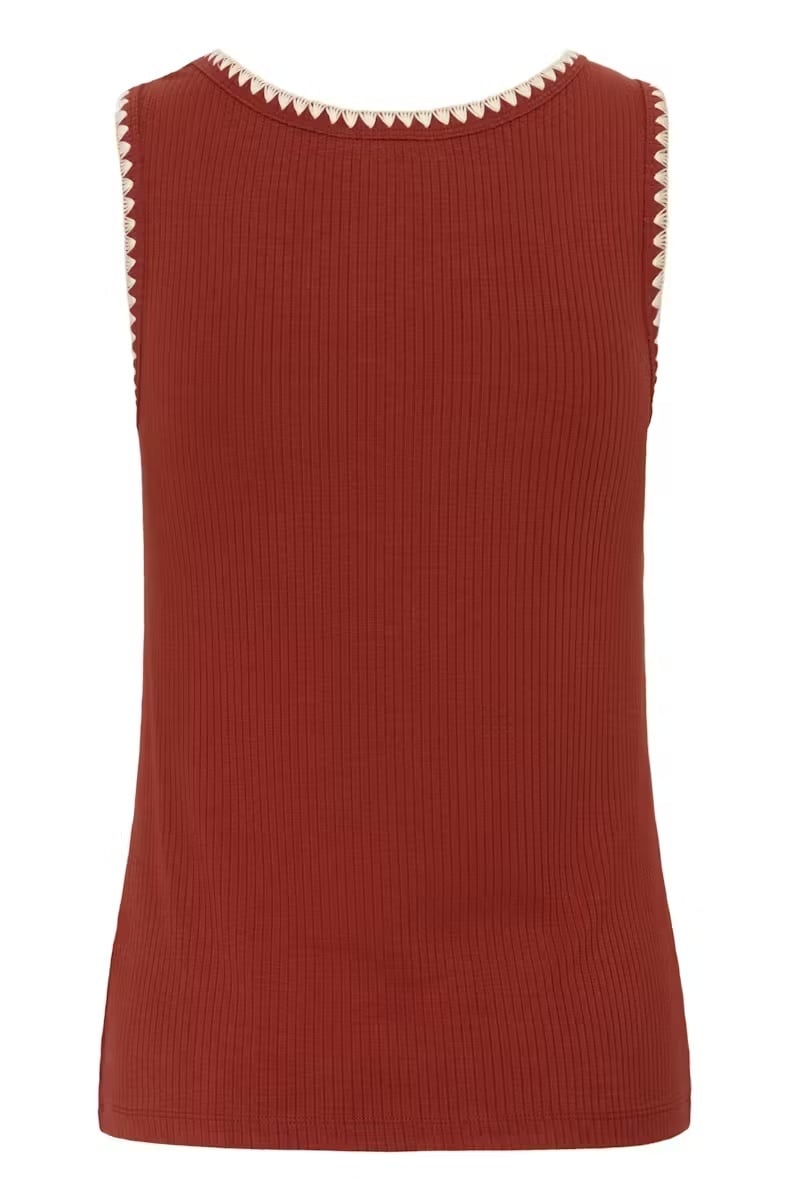 Ribbed tank top with a fitted silhouette, scoop neckline, and striking contrast trim along the neck and arm openings. The soft texture and clean look add effortless style to any outfit.