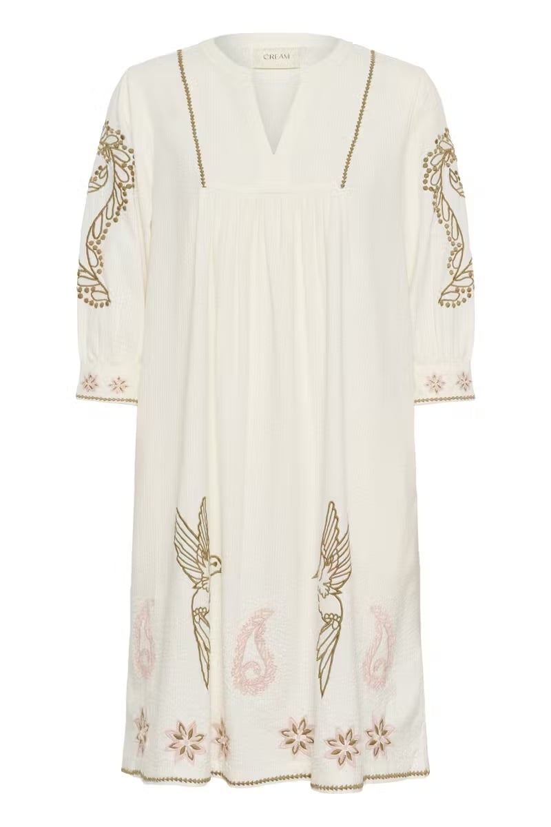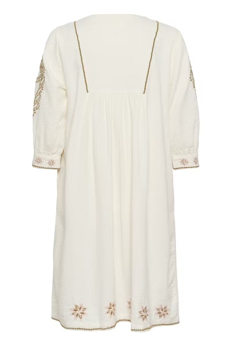This knee-length dress features a loose silhouette, a V-slit neckline, and 3/4 sleeves. It displays visible intricate contrast embroidery along the sleeves, hem, and chest area, as well as along the lower front.