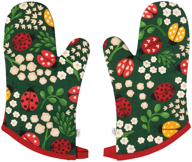 Every kitchen needs a great pair of Ladybugs oven mitts. Made from 100% cotton and lined with silver acrylic coated cotton, each mitt is 13-inches long and measures 6.5-inches from thumb to exterior side. The quilted construction with insulation also help...