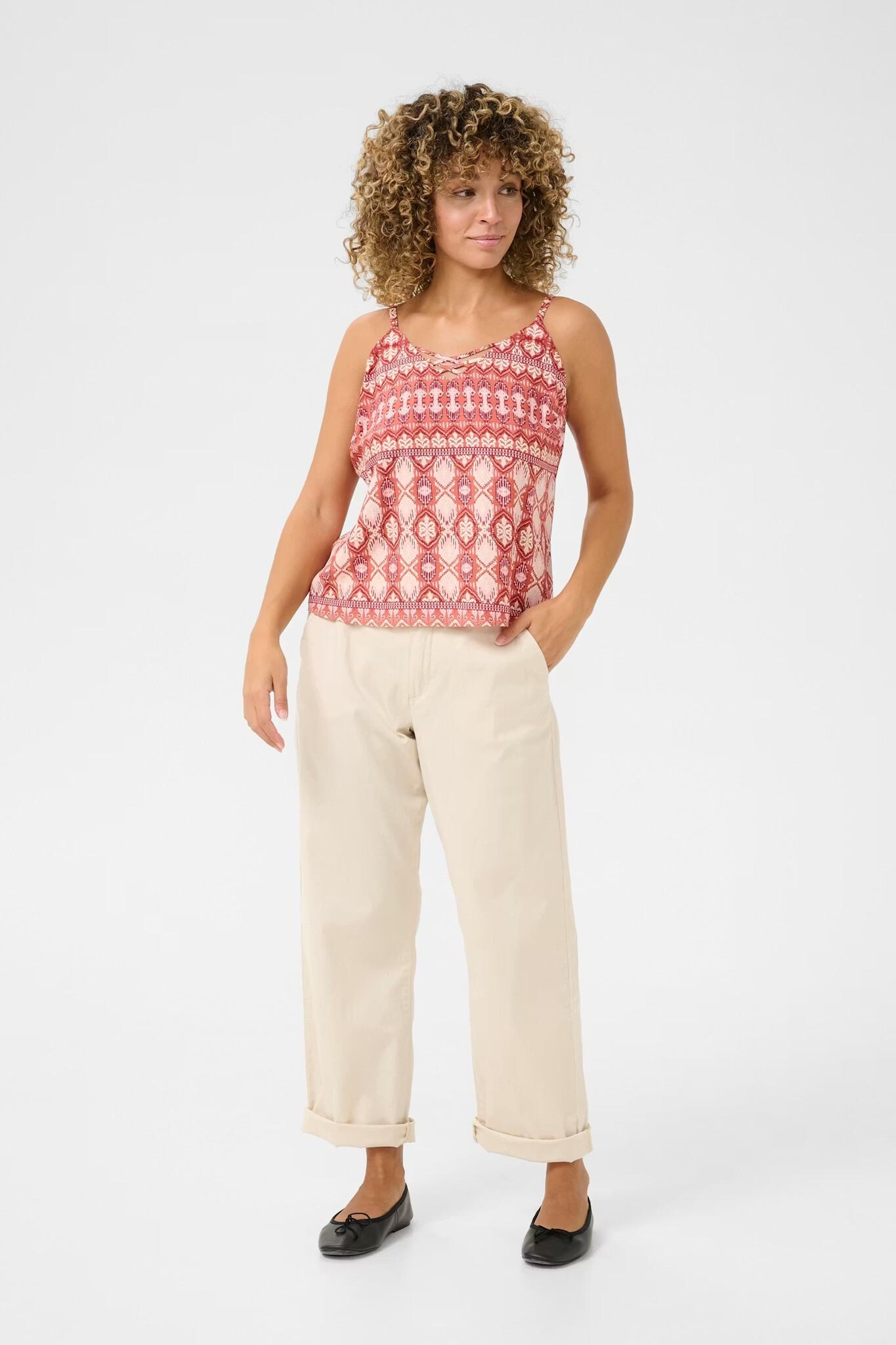 This lightweight top features thin straps, a soft V-neckline with front strap detail, and a relaxed fit. Ideal for warm-weather styling, it pairs effortlessly with skirts, shorts, or layered looks. The model is 170 cm tall and is wearing a size 36.