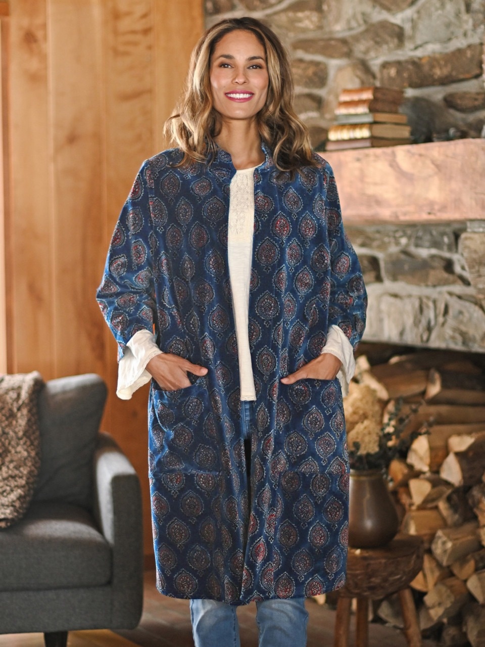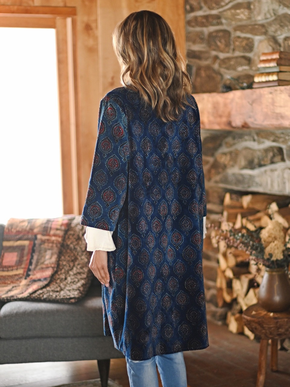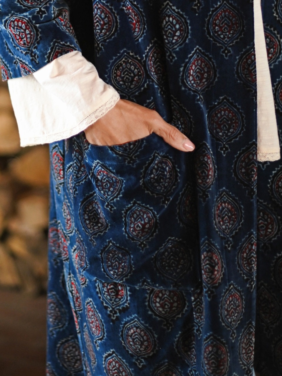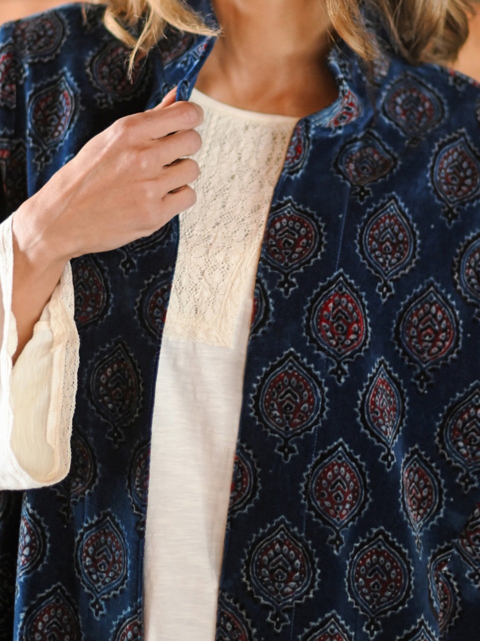 Revel in the rich, naturally dyed indigo of the Vernissage, a cotton velvet masterpiece fashioned with an open front, patch pockets, and a Nehru collar for a stylish silhouette.