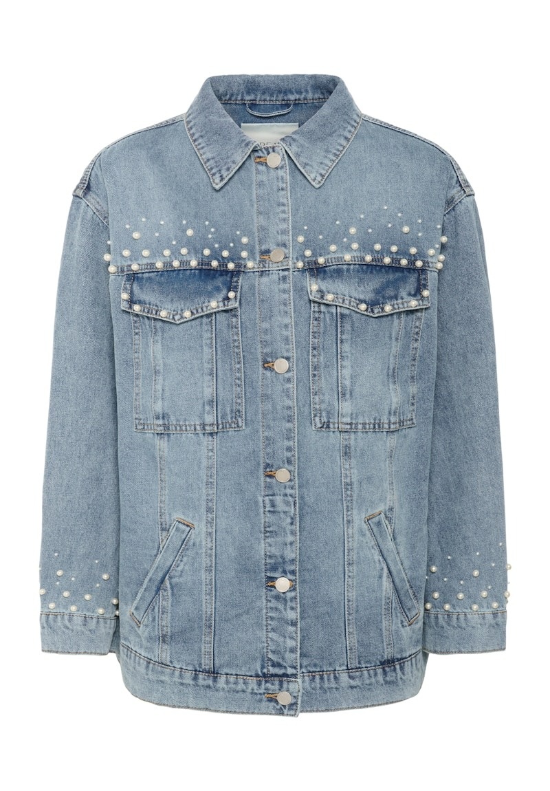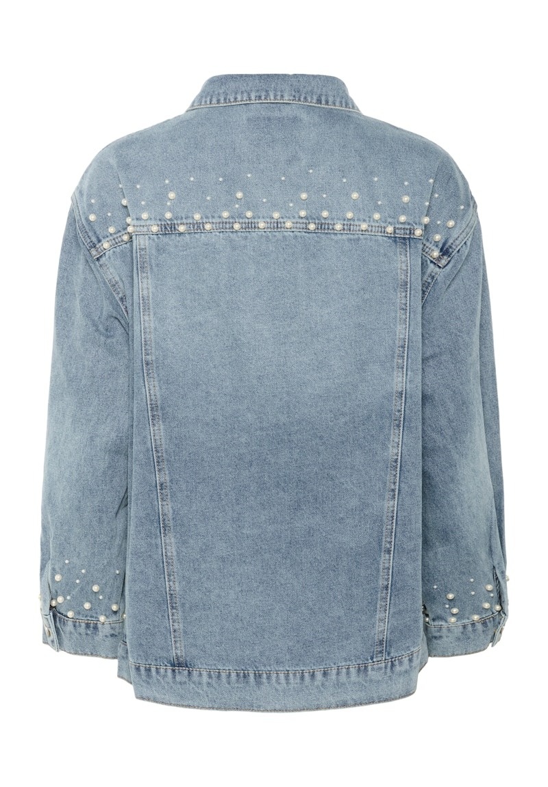 Denim jacket with pearl embellishments offers a relaxed fit, classic collar, button closure, and versatile length. This women's denim outerwear is ideal for casual layering and features practical front pockets.