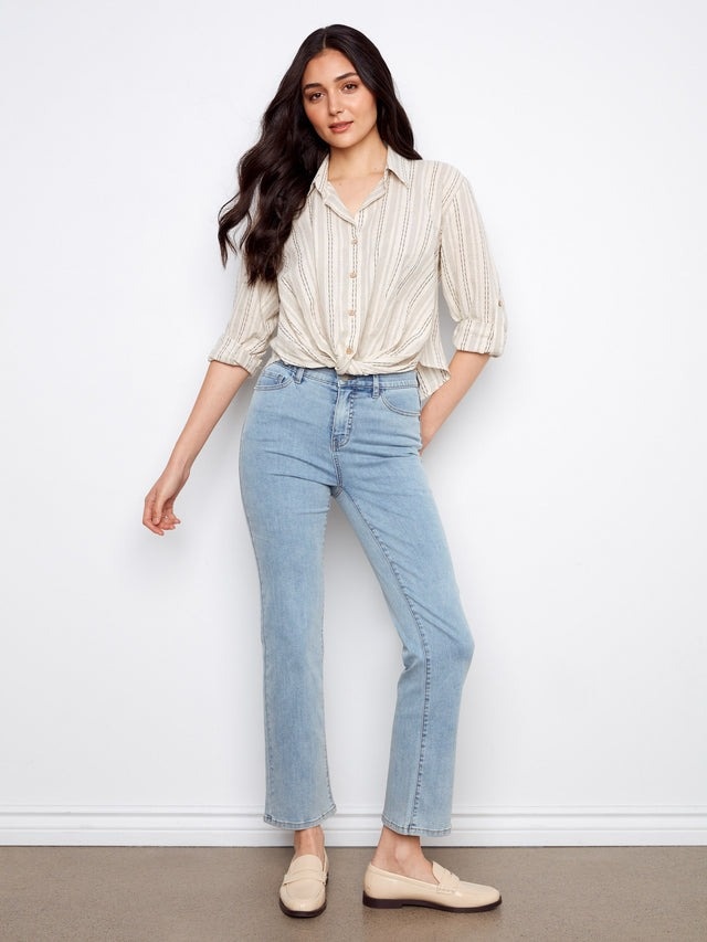 Charlie B Striped Cotton-Linen Blend Shirt With Front Twist