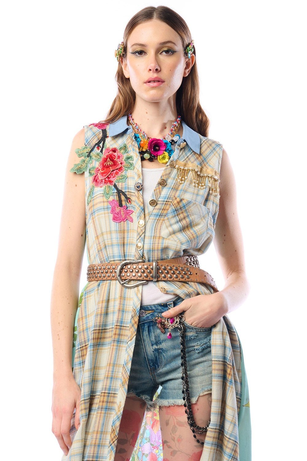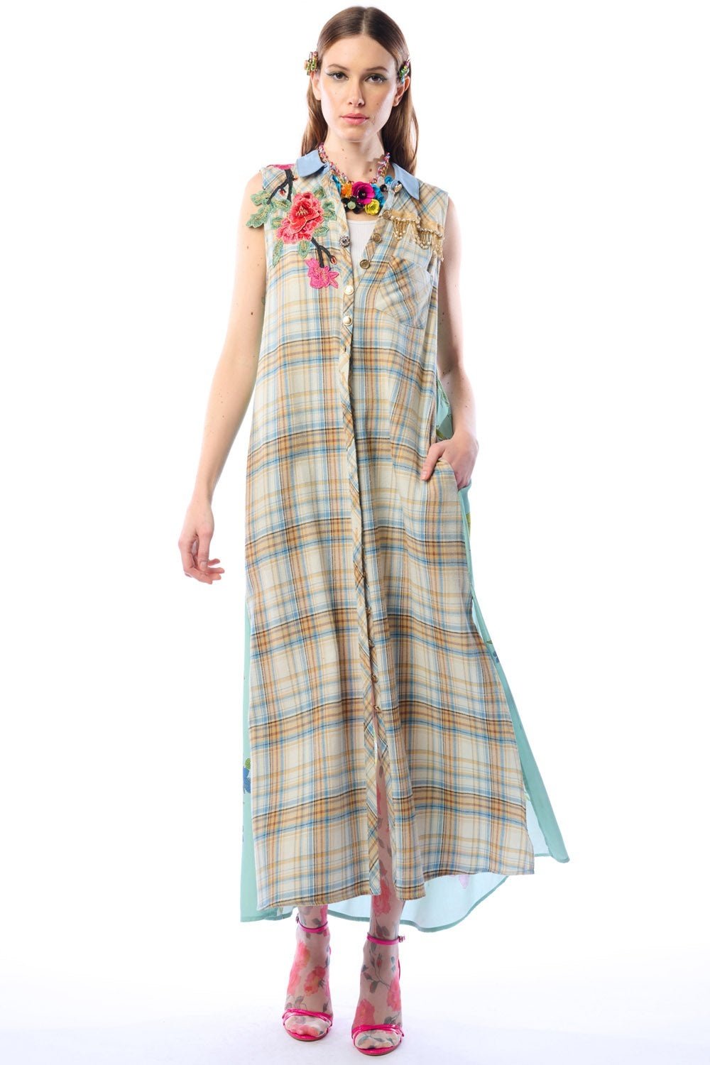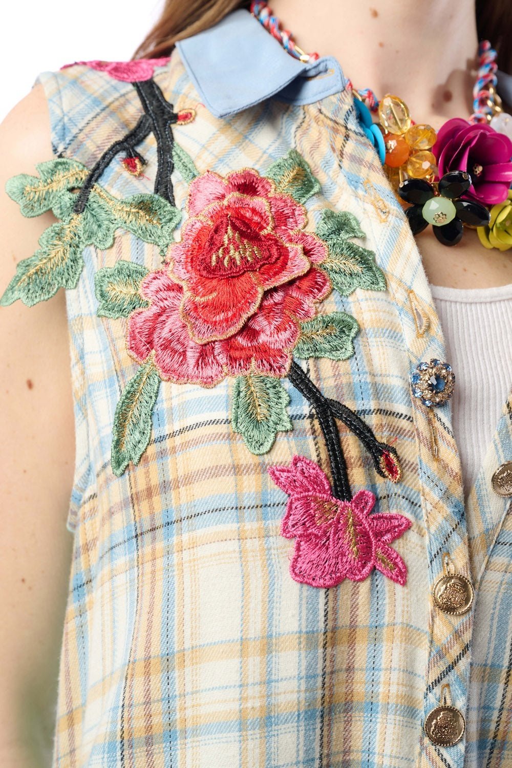 Plaid sleeveless button-up duster with contrast floral print back, floral embroidered patch on right shoulder, above the left-front pocket with crystal tassel trim, CF placket with 1 decorative crystal button