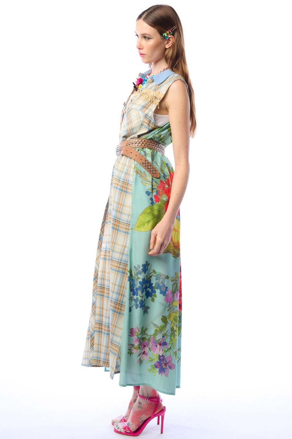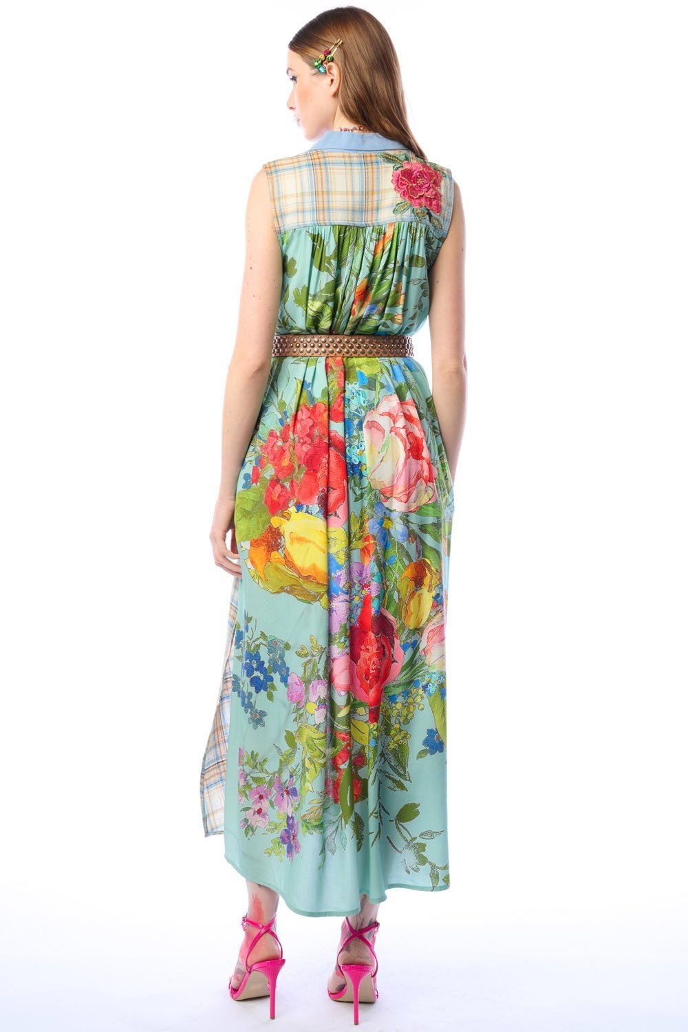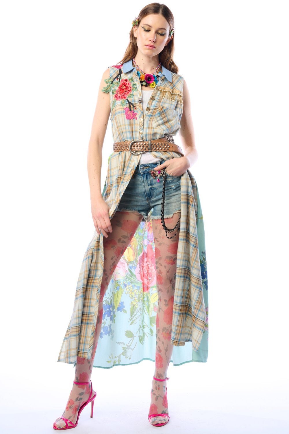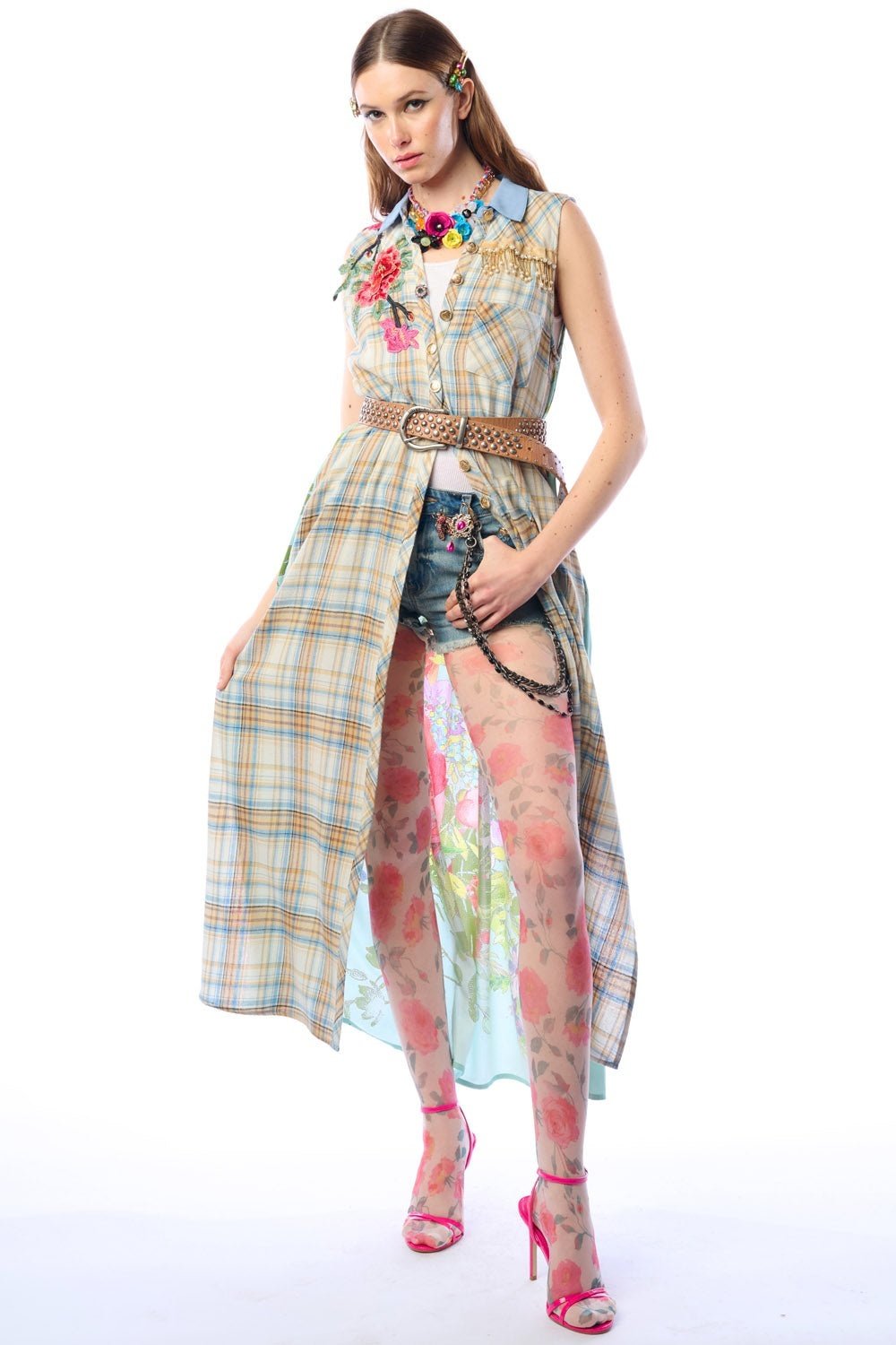 Plaid sleeveless button-up duster with contrast floral print back, floral embroidered patch on right shoulder, above the left-front pocket with crystal tassel trim, CF placket with 1 decorative crystal button